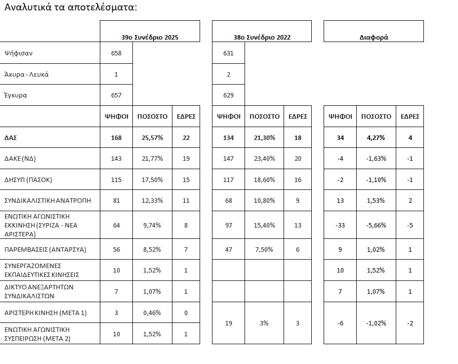 Η ΔΑΣ, που το ψηφοδέλτιό της συγκροτείται με συνδικαλιστές που συσπειρώνονται στο Π.Α.ΜΕ. με μεγάλη άνοδο σε ψήφους, ποσοστά και έδρες – από 134 ψήφους, 21,3% και 18 έδρες το 2022 σε 168 ψήφους, 22 έδρες και 25,57% – αναδείχθηκε πρώτη δύναμη γκρεμίζοντας την κυβερνητική παράταξη της ΔΑΚΕ από αυτή τη θέση.