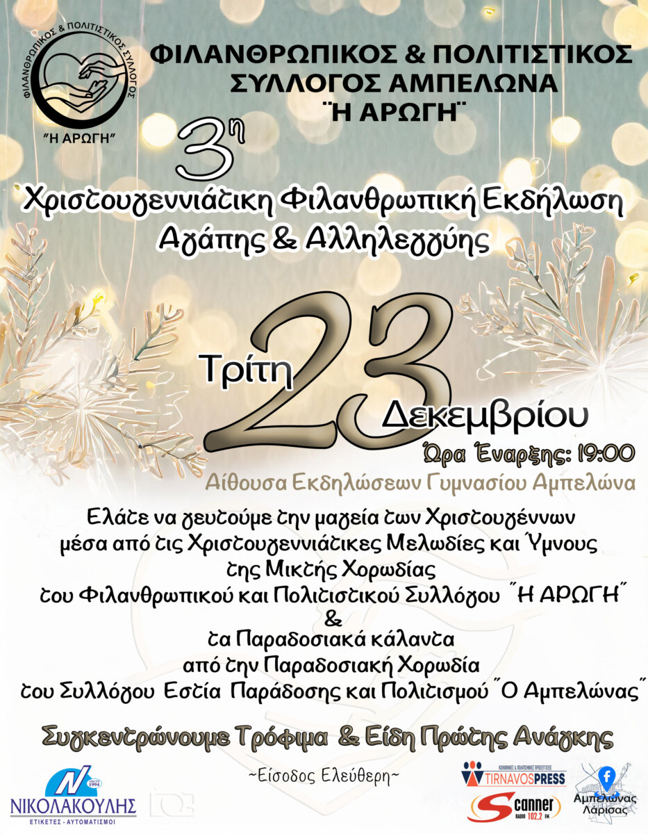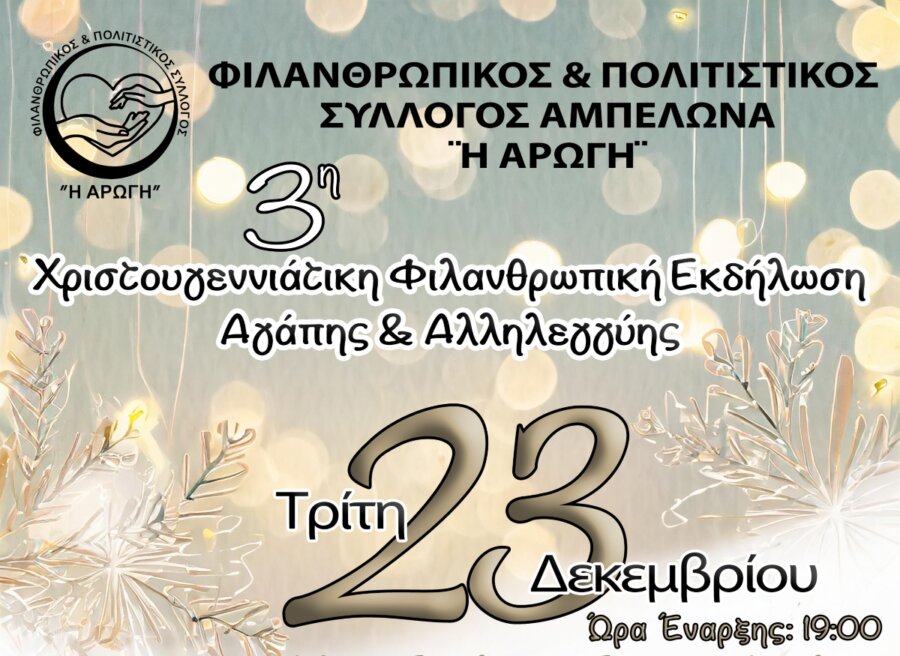 Ο Φιλανθρωπικός και Πολιτιστικός Σύλλογος ¨Η ΑΡΩΓΗ¨ Αμπελώνα σας προσκαλεί στην Χριστουγεννιάτικη Φιλανθρωπική Εκδήλωση Αγάπης και Αλληλεγγύης την Τρίτη 23 Δεκεμβρίου 2025 και ώρα 19:00 στην αίθουσα εκδηλώσεων του Γυμνασίου Αμπελώνα.
