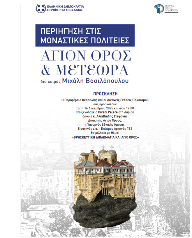 Μετά την μεγάλη επιτυχία της Έκθεσης «Περιήγηση στις Μοναστικές Πολιτείες – Άγιον Όρος & Μετέωρα» δια χειρός Μιχάλη Βασιλόπουλου, που παρουσιάστηκε φέτος στη Λάρισα, η Περιφέρεια Θεσσαλίας και οι Διεθνείς Σχέσεις Πολιτισμού διοργανώνουν μια σημαντική εκδήλωση πριν κλείσει η χρονιά, και σας προσκαλούν την Τρίτη 16 Δεκεμβρίου 2025 και ώρα 19.00 στο ξενοδοχείο Divani Palace στη Λάρισα, όπου ο κύριος Αλκιβιάδης Στεφανής, Διοικητής του Αγίου Όρους, τ. Υπουργός Εθνικής Άμυνας, Στρατηγός ε.α. – Επίτιμος Αρχηγός ΓΕΣ, θα μιλήσει με θέμα: Θρησκευτική διπλωματία και Άγιο Όρος.