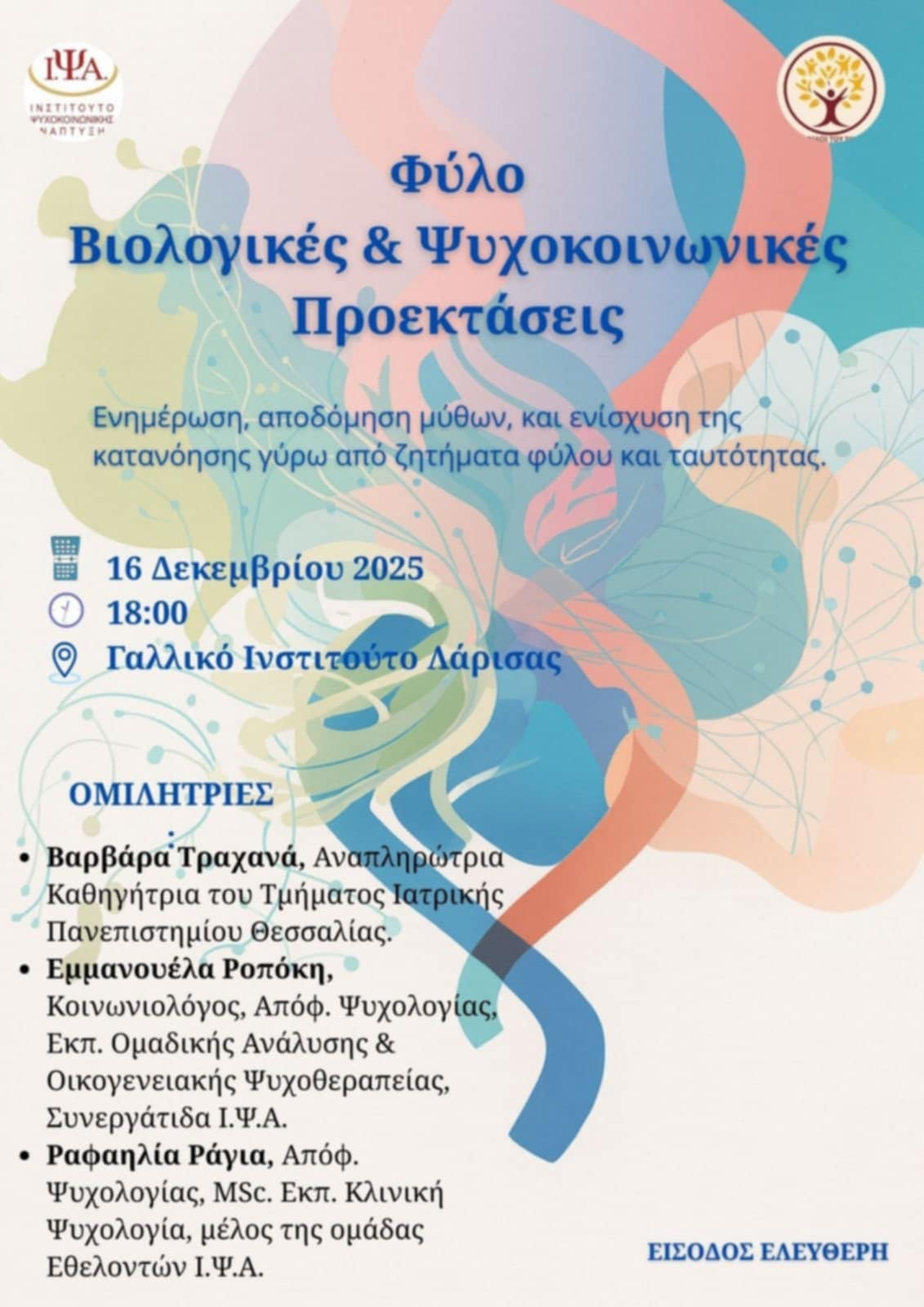 Ο Σύλλογος Φίλοι του ΙΨΑ διοργανώνει εκδήλωση με τίτλο «Φύλο: Βιολογικές και ψυχοκοινωνικές προεκτάσεις» την Τρίτη 16 Δεκεμβρίου στις 18.00 στο Γαλλικό Ινστιτούτο.