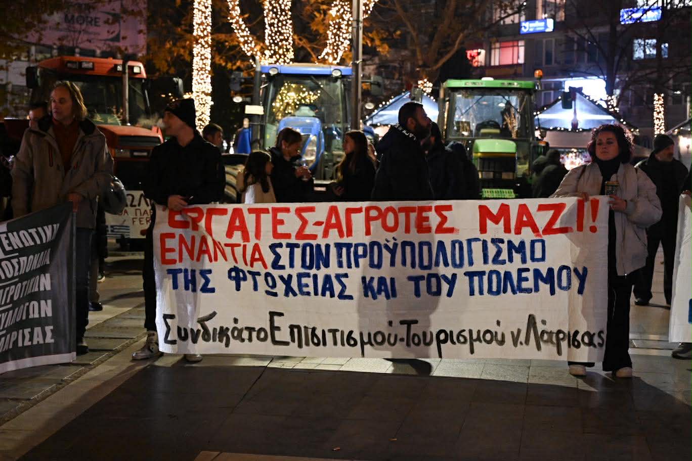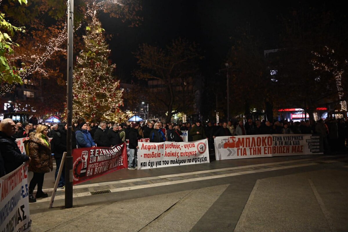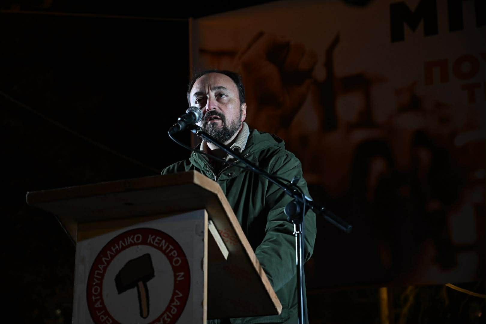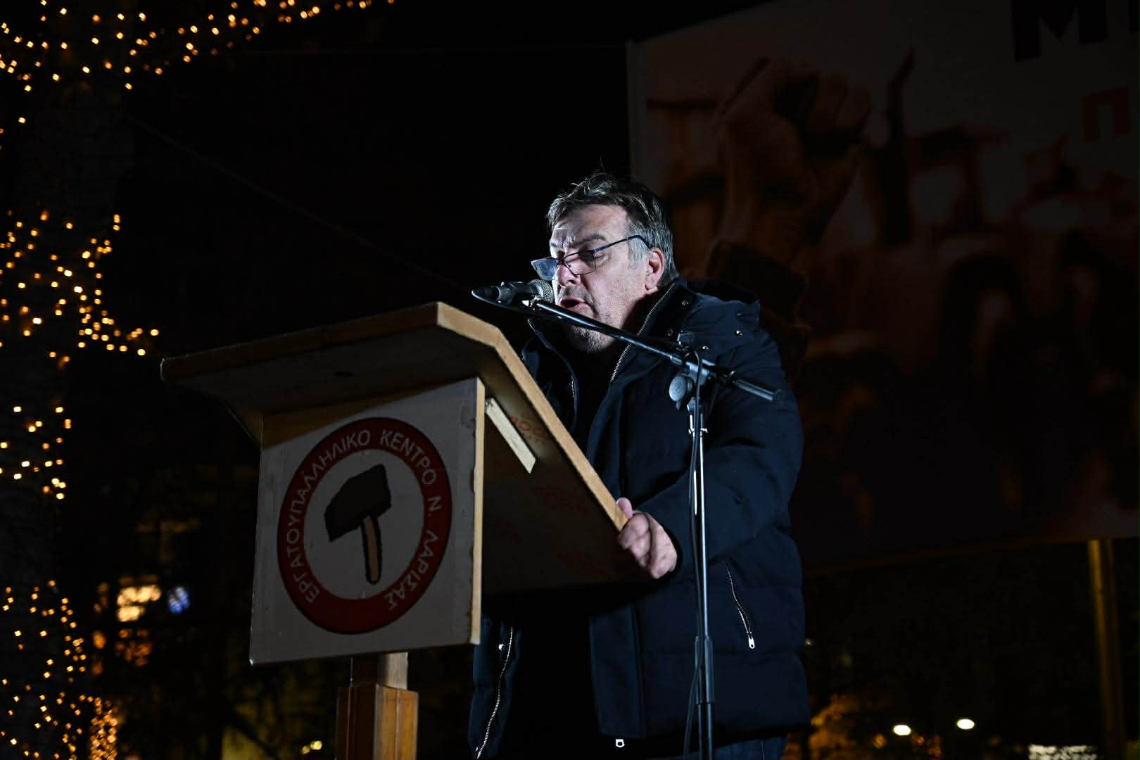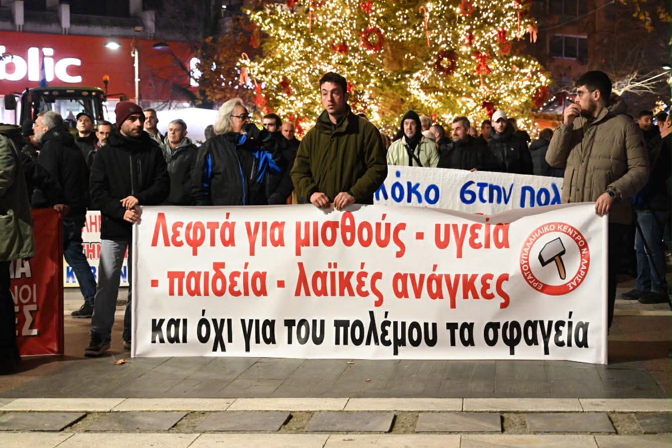 Στην ομιλία του ο πρόεδρος του Εργατικού Κέντρου Λάρισας, Γιάννης Σκόκας, υπογράμμισε την ανάγκη ενότητας και κοινού αγώνα όλων των εργαζομένων και των αγροτών: