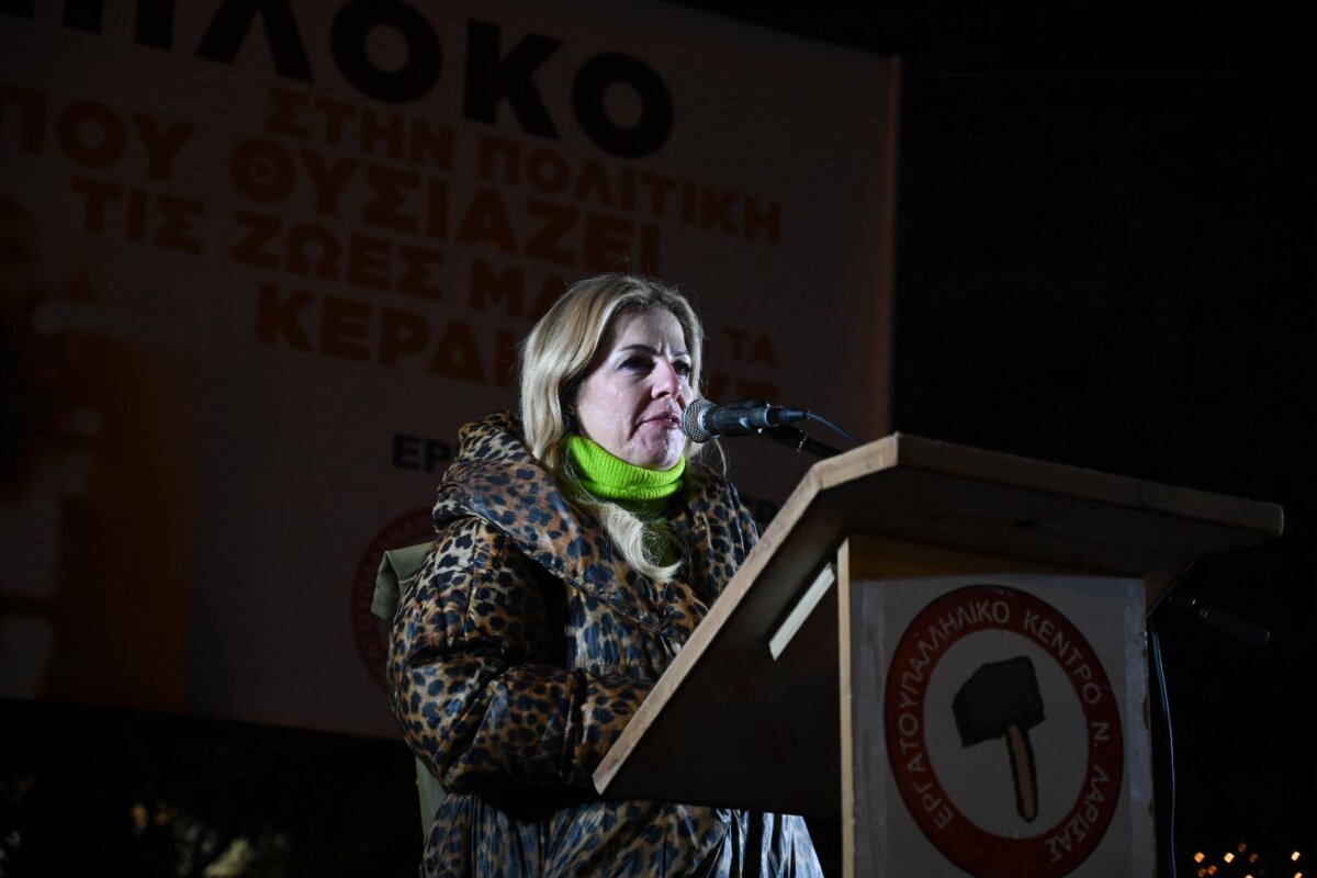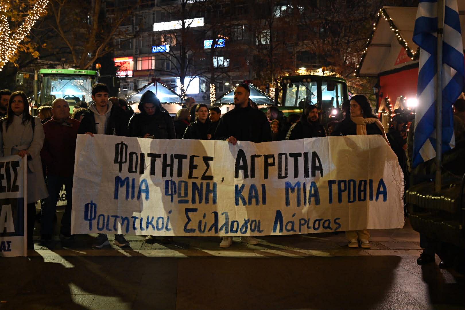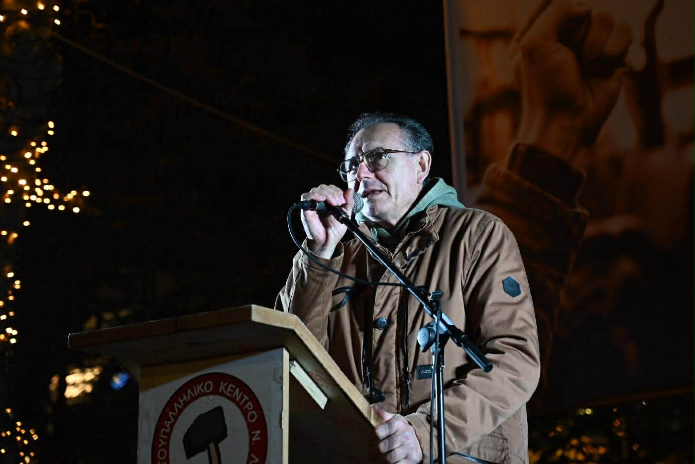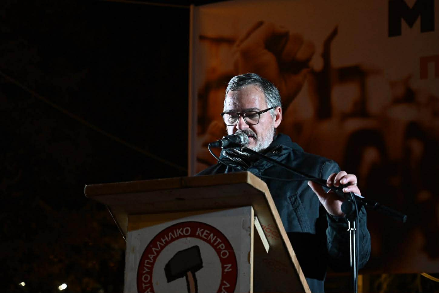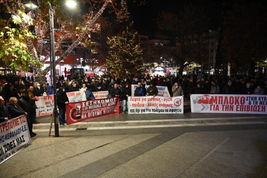 Στην ομιλία του ο πρόεδρος του Εργατικού Κέντρου Λάρισας, Γιάννης Σκόκας, υπογράμμισε την ανάγκη ενότητας και κοινού αγώνα όλων των εργαζομένων και των αγροτών:
