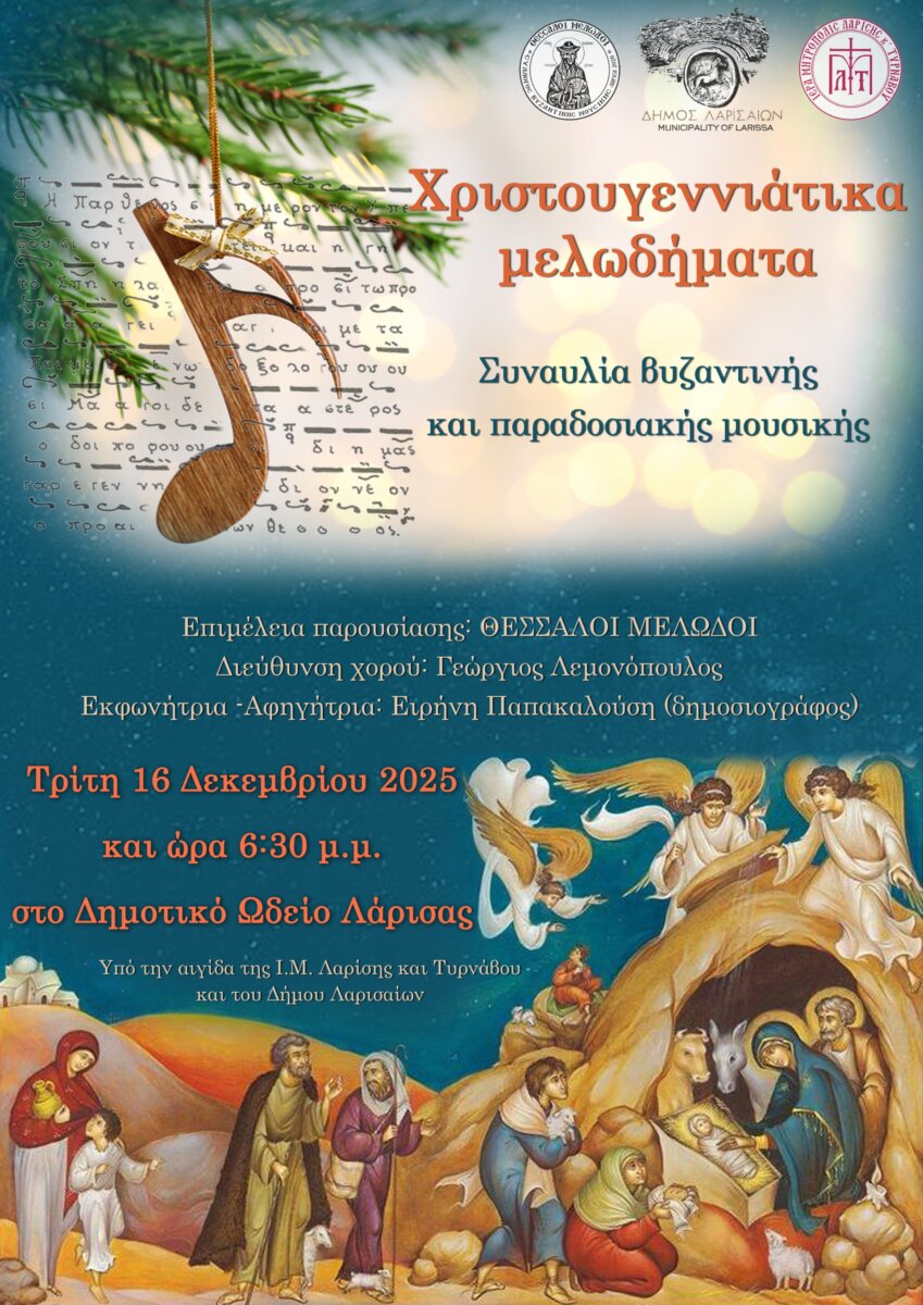 Ο Σύλλογος βυζαντινής μουσικής «Θεσσαλοί Μελωδοί» πραγματοποιεί εορταστική εκδήλωση-συναυλία βυζαντινής και παραδοσιακής μουσικής της χορωδίας του Συλλόγου μας την Τρίτη 16 Δεκεμβρίου 2025 και ώρα 6:30 μ.μ. στο Δημοτικό Ωδείο Λάρισας.