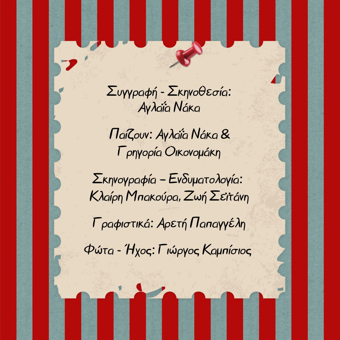 Συγγραφή – Σκηνοθεσία: Αγλαΐα Νάκα Παίζουν: Αγλαΐα Νάκα & Γρηγορία Οικονομάκη Σκηνογραφία – Ενδυματολογία: Κλαίρη Μπακούρα, Ζωή Σεϊτάνη Γραφιστικά: Αρετή Παπαγγέλη Φώτα – Ήχος: Γιώργος Καμπίσιος Παραγωγή: Qualia – Circus entertainment hub