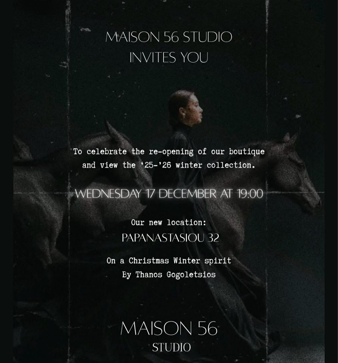 Το Maison 56 Studio, ο νέος χώρος του Θάνου Γκογκολέτσιου, ανοίγει απόψε στις 19:00 και επίσημα, στη νέα του διεύθυνση Παπαναστασίου 32, σε πνεύμα, φυσικά, Χριστουγεννιάτικο!
