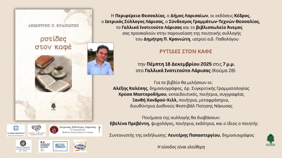 Η Περιφέρεια Θεσσαλίας, ο Δήμος Λαρισαίων, οι εκδόσεις Κέδρος, ο Ιατρικός Σύλλογος Λάρισας, ο Σύνδεσμος Γραμμάτων-Τεχνών Θεσσαλίας, το Γαλλικό Ινστιτούτο Λάρισας και το βιβλιοπωλείο «Άνεμος» διοργανώνουν την εκδήλωση παρουσίασης της νέας ποιητικής συλλογής «Ρυτίδες στον καφέ» του Δημήτρη Π. Κρανιώτη, ιατρού ειδικού παθολόγου, την Πέμπτη 18 Δεκεμβρίου 2025 στις 7μ.μ. στο Γαλλικό Ινστιτούτο Λάρισας (Κούμα 28).