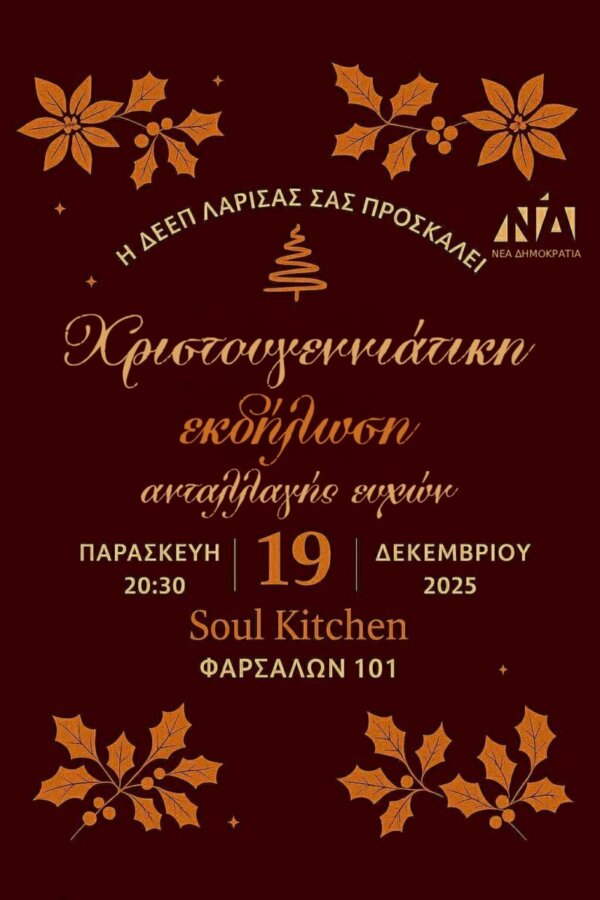 Η Δ.Ε.Ε.Π. Λάρισας Ν.Δ. προσκαλεί όλα τα μέλη και τους φίλους της Νέας Δημοκρατίας αύριο Παρασκευή 19 Δεκεμβρίου 2025 στο Soul Kitchen, Φαρσάλων 101, για την ανταλλαγή ευχών ενόψει των Χριστουγέννων και τον ερχομό της νέας χρονιάς.