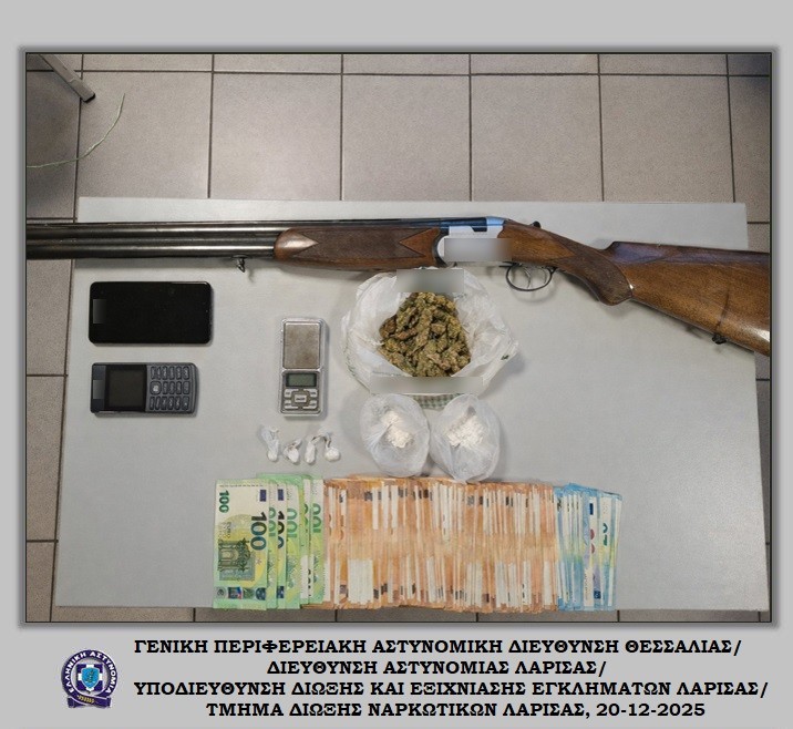 “Συνελήφθη, χθες (19-12-2025) το μεσημέρι στη Λάρισα, από αστυνομικούς του Τμήματος Δίωξης Ναρκωτικών της Υποδιεύθυνσης Δίωξης και Εξιχνίασης Εγκλημάτων Λάρισας, ένας ημεδαπός άνδρας, σε βάρος του οποίου σχηματίστηκε δικογραφία για παράβαση των νομοθεσιών περί ναρκωτικών και περί όπλων.