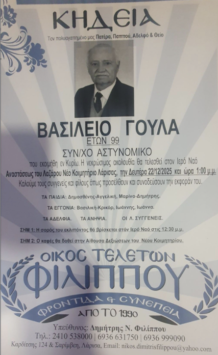 Έφυγε από τη ζωή σε ηλικία 99 ετών ο Βασίλειος Γούλας.
