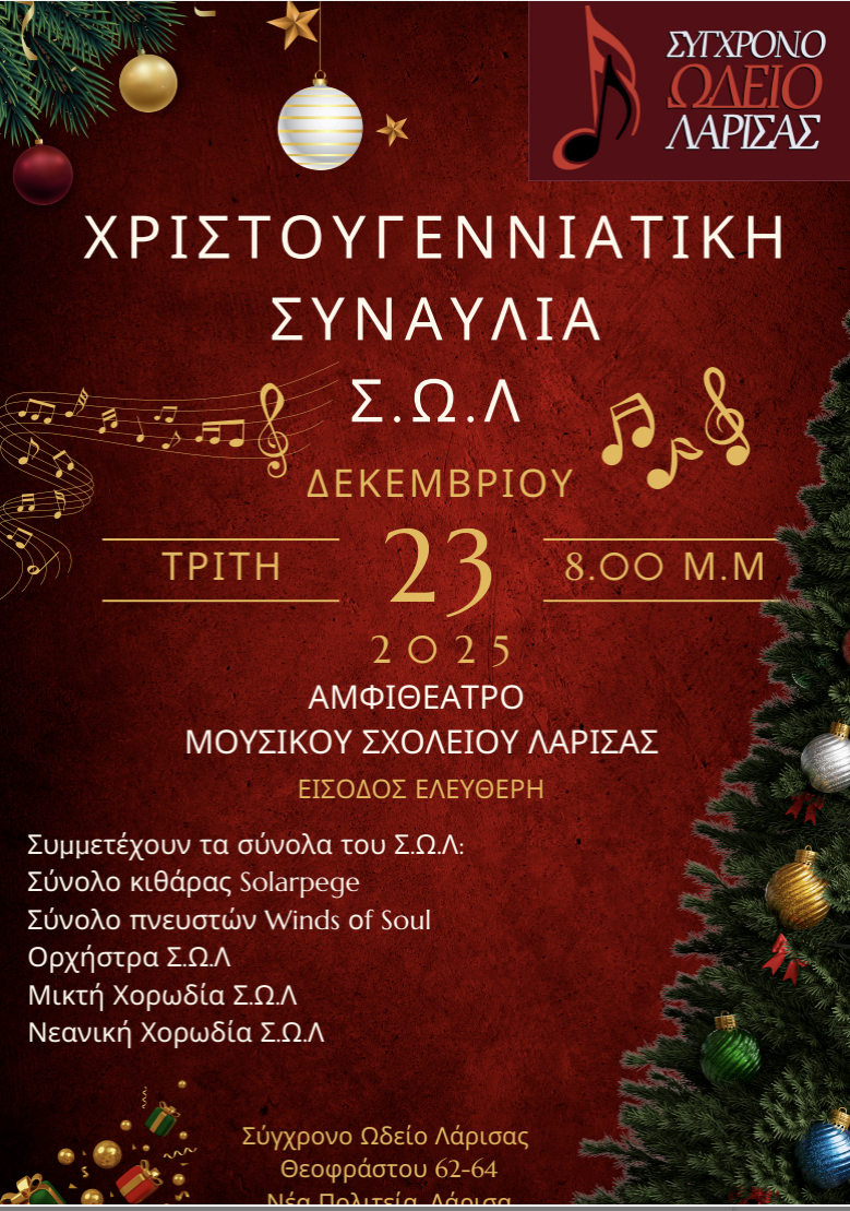 Το Σύγχρονο Ωδείο Λάρισας σας προσκαλεί με χαρά στην τελευταία Χριστουγεννιάτικη συναυλία των συνόλων του την Τρίτη 23 Δεκεμβρίου και ώρα 8.00 μ. μ. στο αμφιθέατρο του Μουσικού Σχολείου Λάρισας.