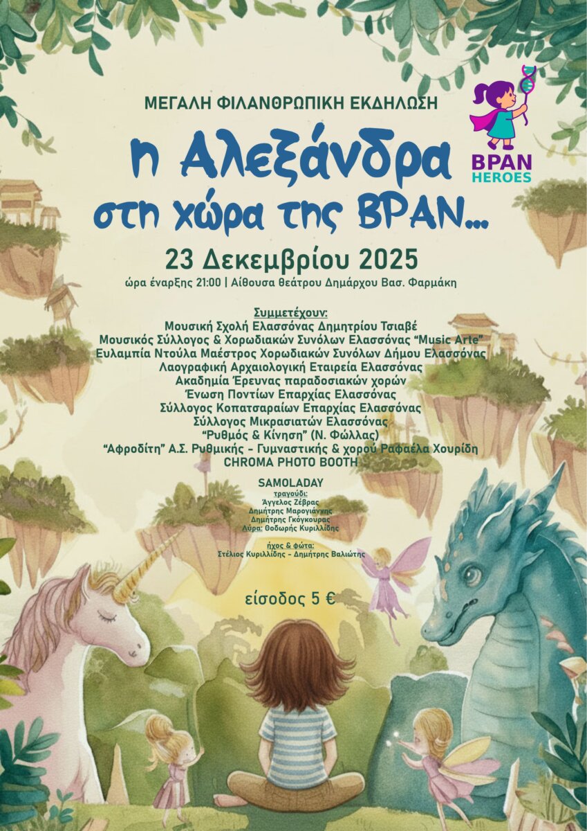 Στις 23 Δεκεμβρίου 2025, ώρα 21:00, στην Αίθουσα «Βασίλειος Φαρμάκης» στην Ελασσόνα, σας προσκαλούμε σε μια ξεχωριστή βραδιά γεμάτη μουσική, αφήγηση και ανθρωπιά «Η Αλεξάνδρα στη χώρα της BPAN».