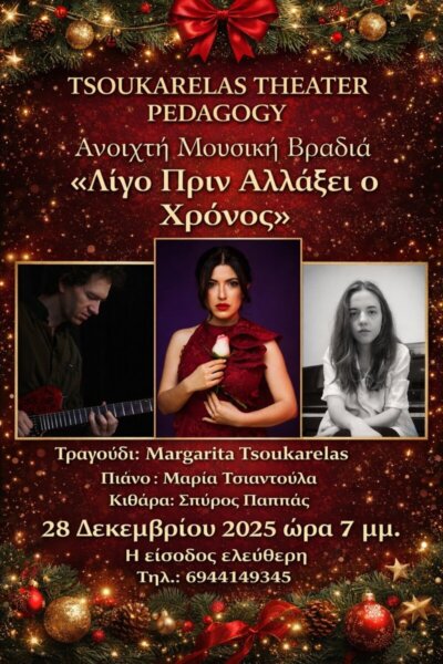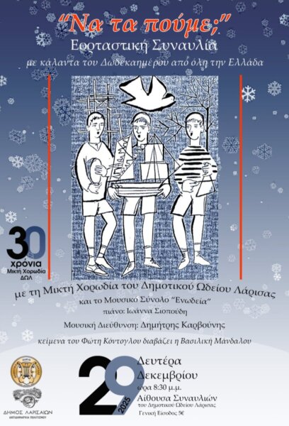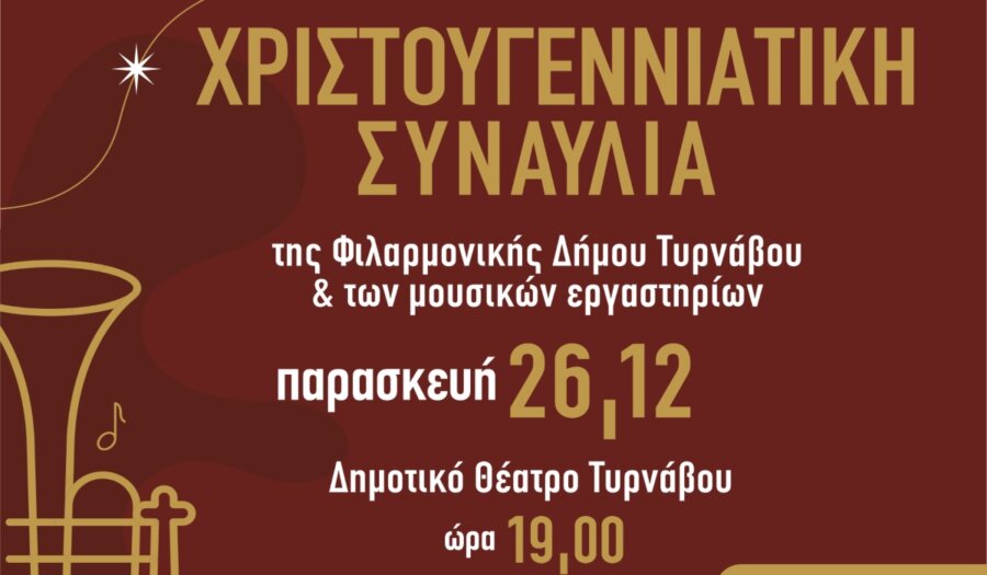 Χριστουγεννιάτικη συναυλία της Φιλαρμονικής Δήμου Τυρνάβου θα πραγματοποιηθεί την Παρασκευή 26 Δεκεμβρίου 2025 στις 7:00μμ στο Δημοτικό Θέατρο Τυρνάβου.