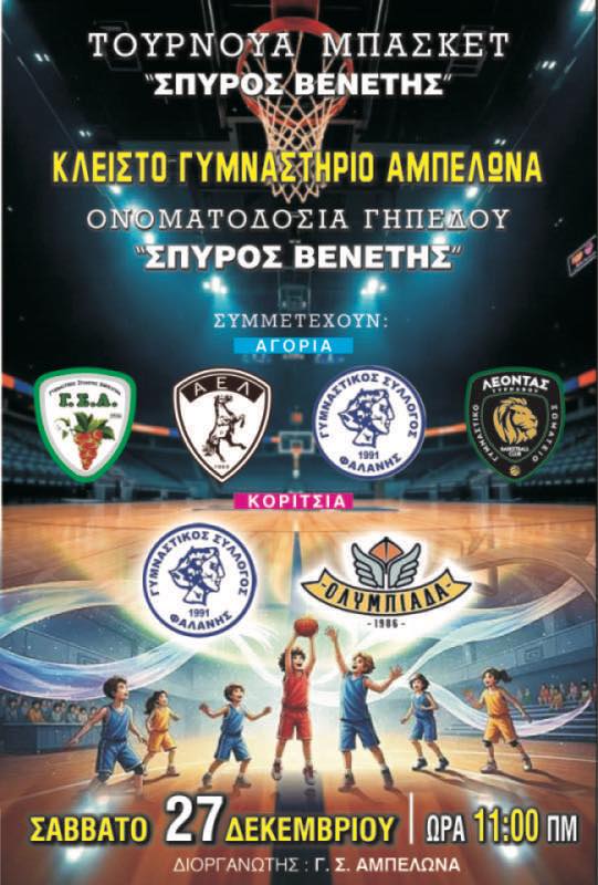 Το τουρνουά διοργανώνει για μία ακόμη χρονιά ο τοπικός Γυμναστικός Σύλλογος Αμπελώνα και θα ξεκινήσει στις 11 π.μ στο Κλειστό Γυμναστήριο Αμπελώνα, με τη συμμετοχή των παιδικών τμημάτων των ομάδων μπάσκετ Γ.Σ. ΑΜΠΕΛΩΝΑ 1986, ΑΕΛ, Γ.Σ. ΦΑΛΑΝΗΣ, ΛΕΟΝΤΑ ΤΥΡΝΑΒΟΥ & ΟΛΥΜΠΙΑΔΑΣ ΛΑΡΙΣΑΣ.
