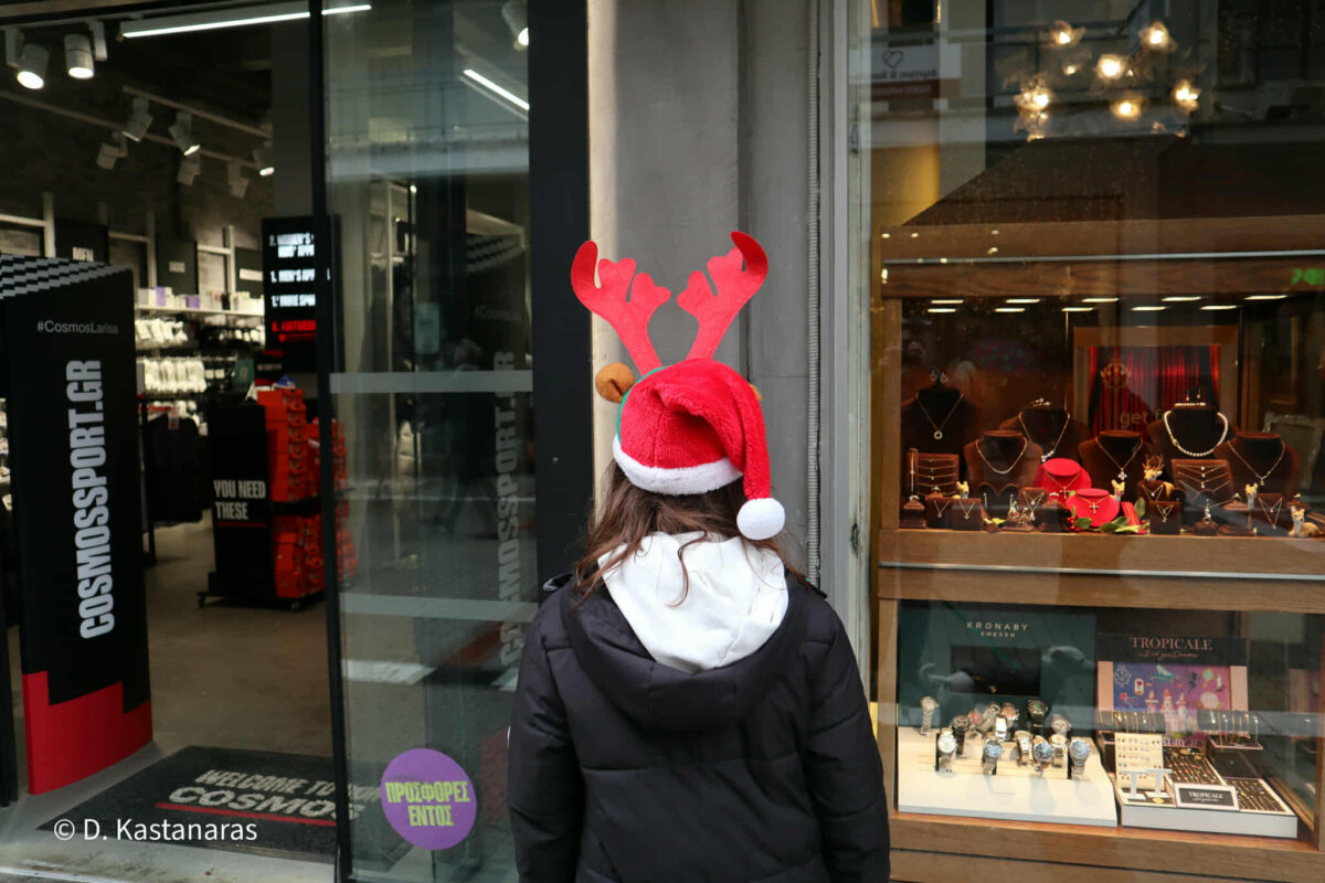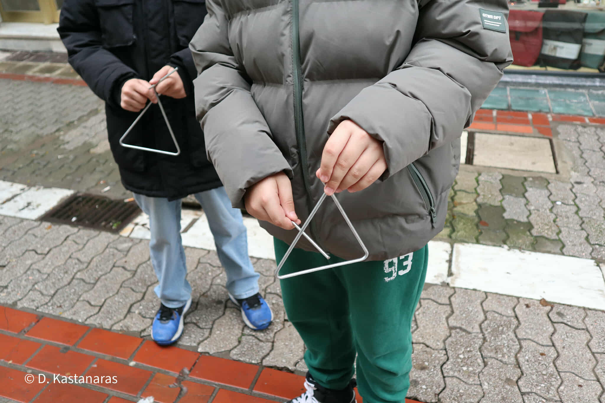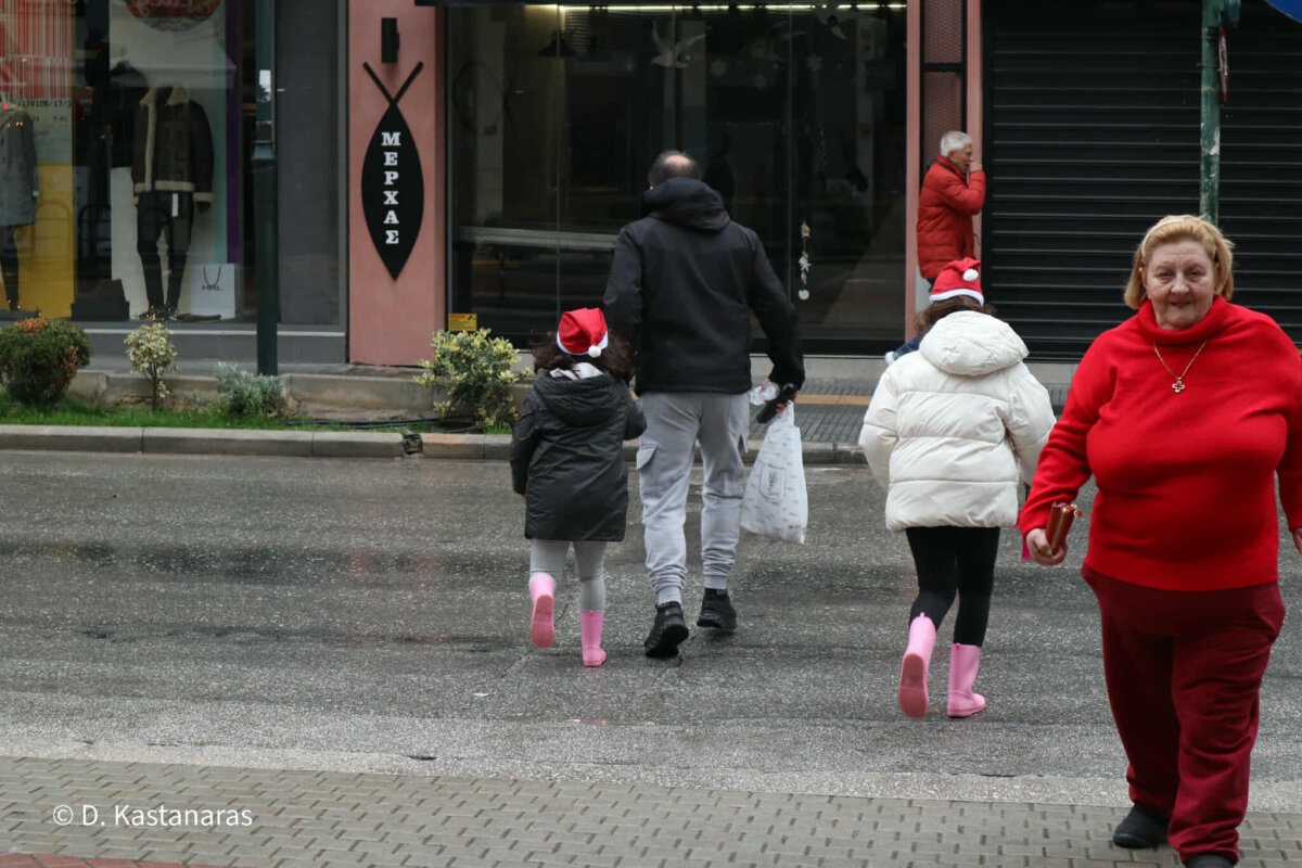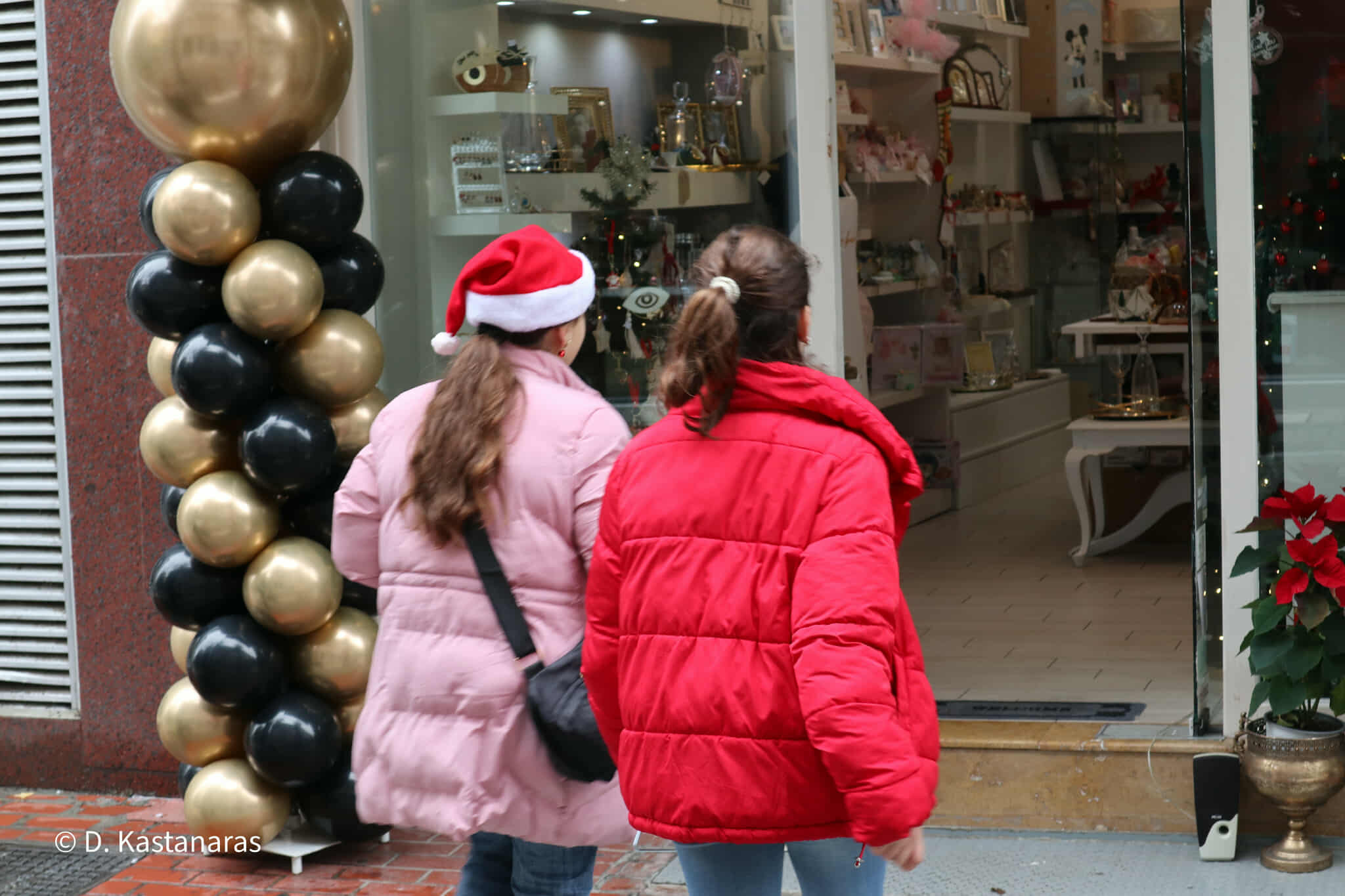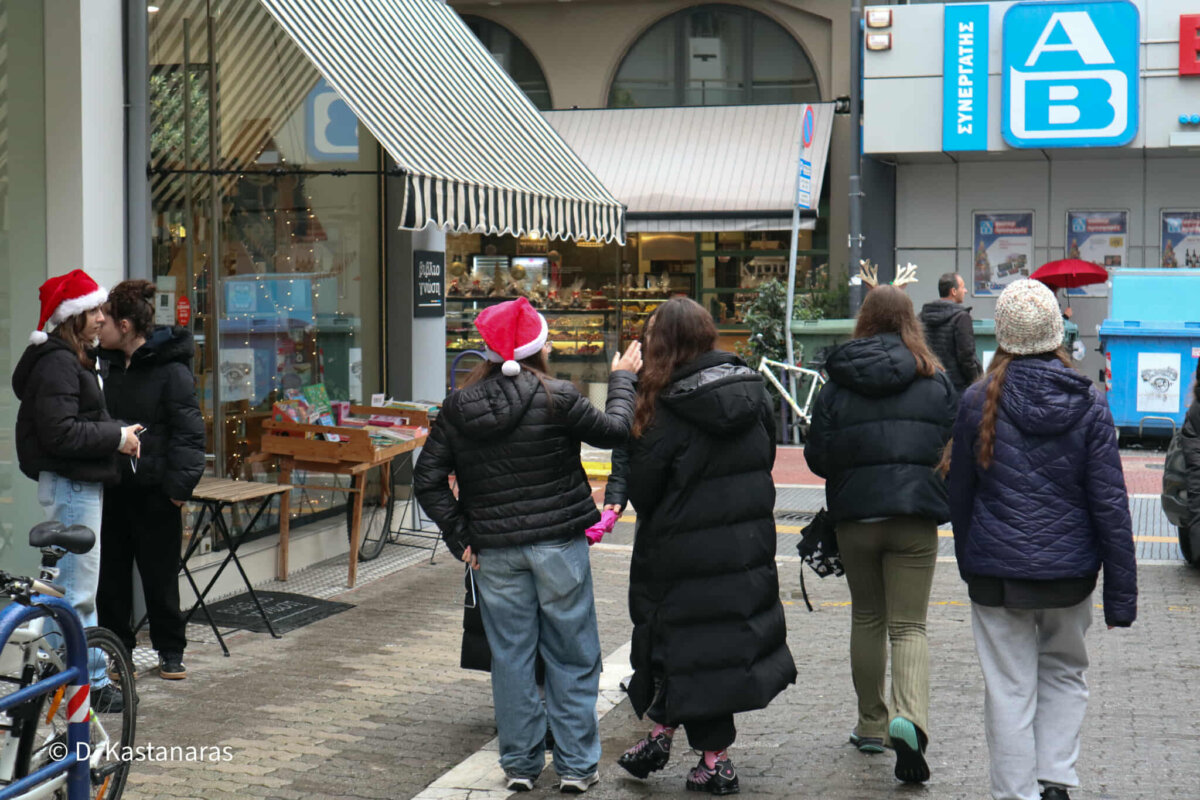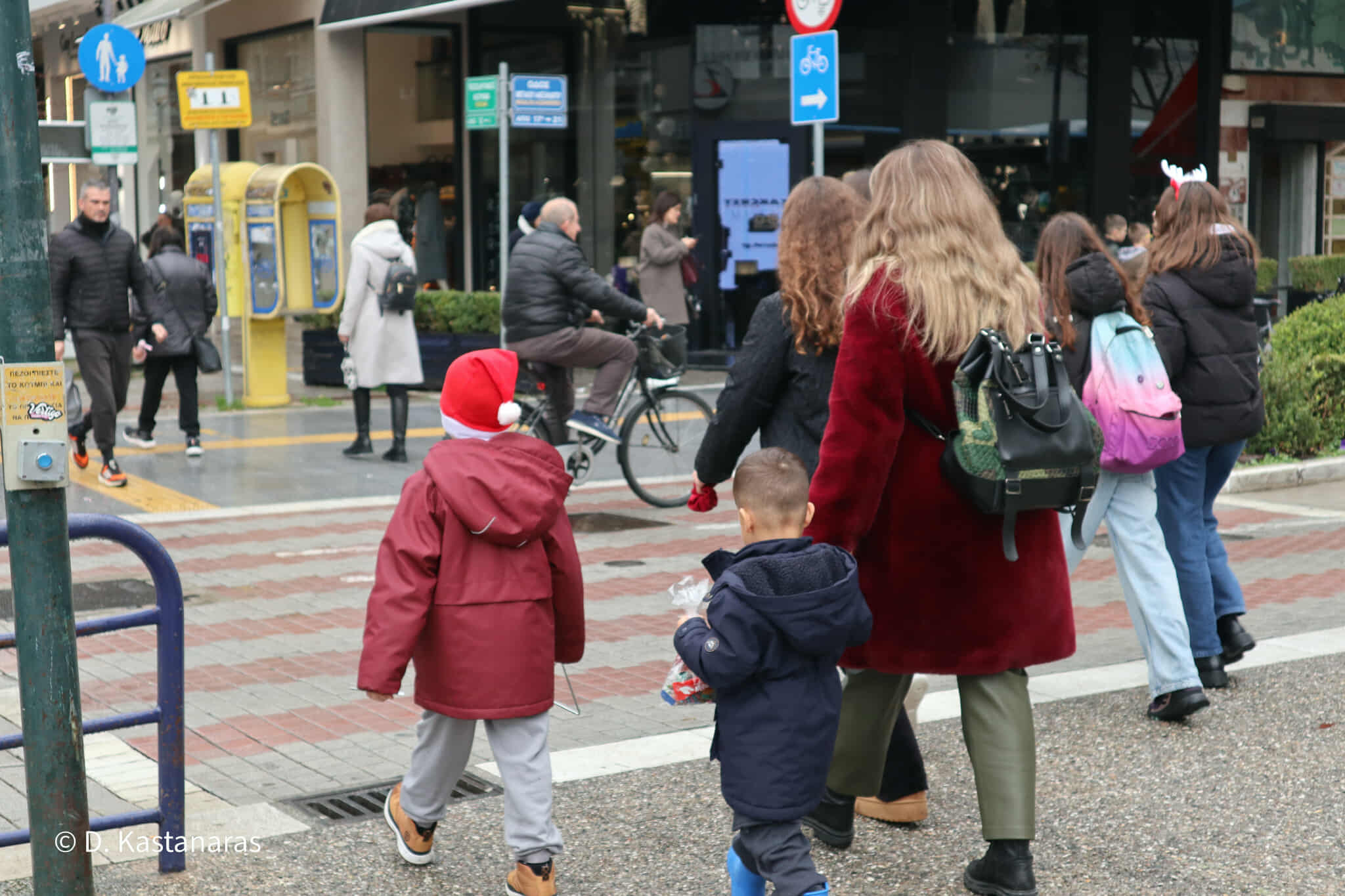 Παιδιά που με τα τριγωνάκια τους και τους κόκκινους σκούφους έχουν γεμίσει το κέντρο της πόλης με τα κάλαντα των Χριστουγέννων, συντροφεύοντας και όλους εκείνους που έχουν αποφασίσει να κάνουν τις αγορές τους σήμερα το πρωί.