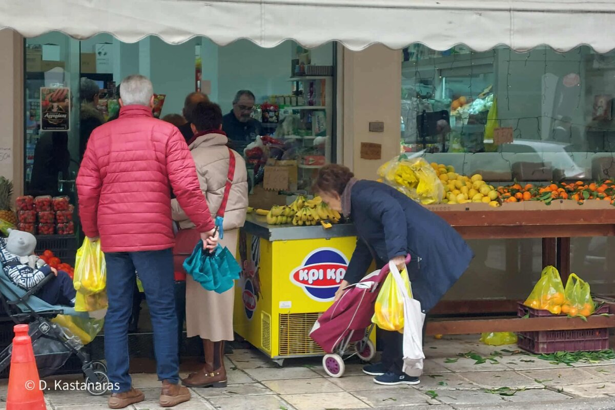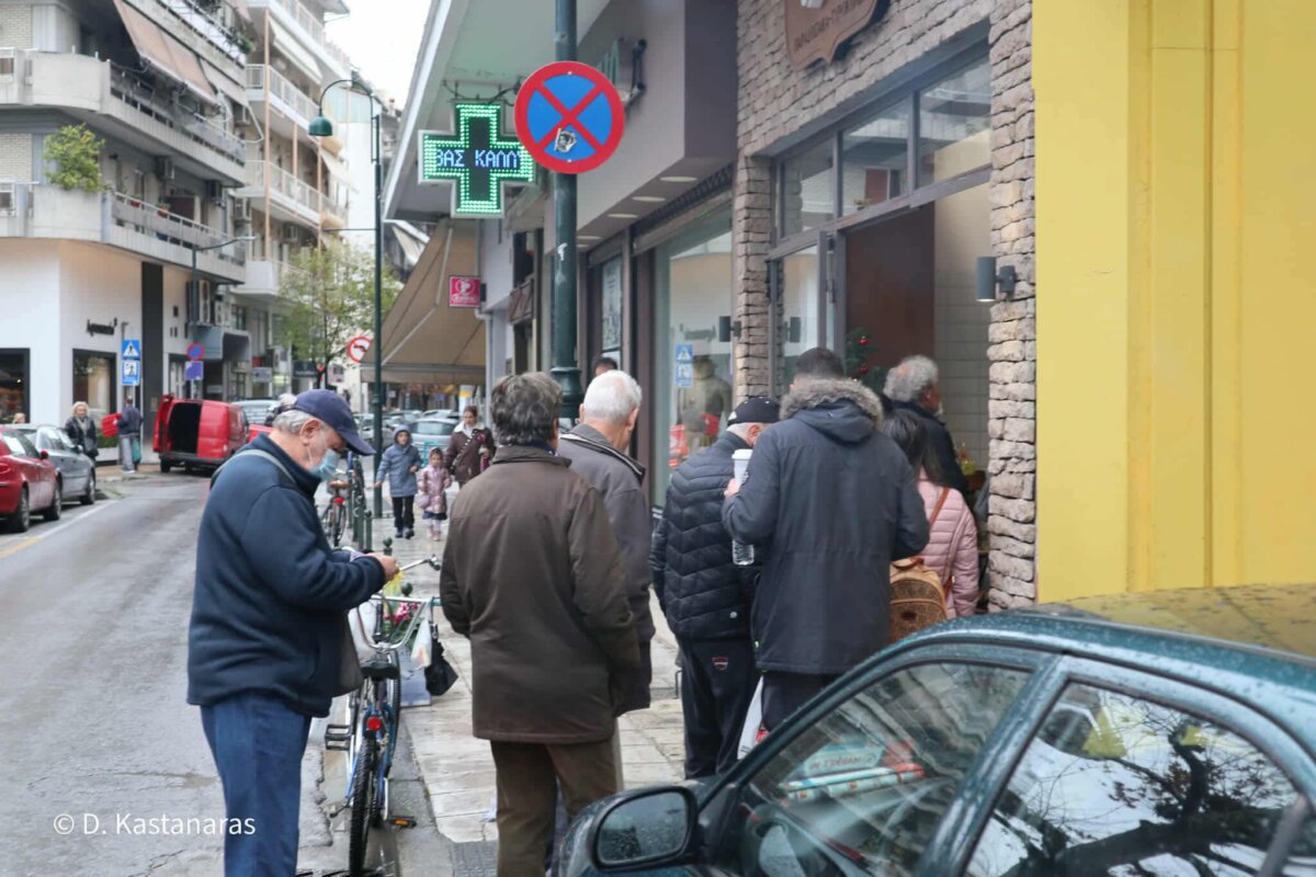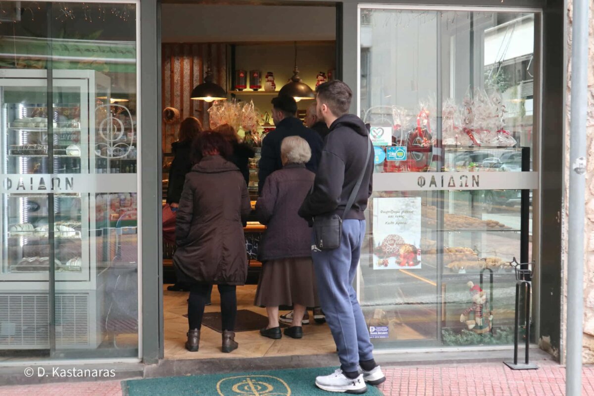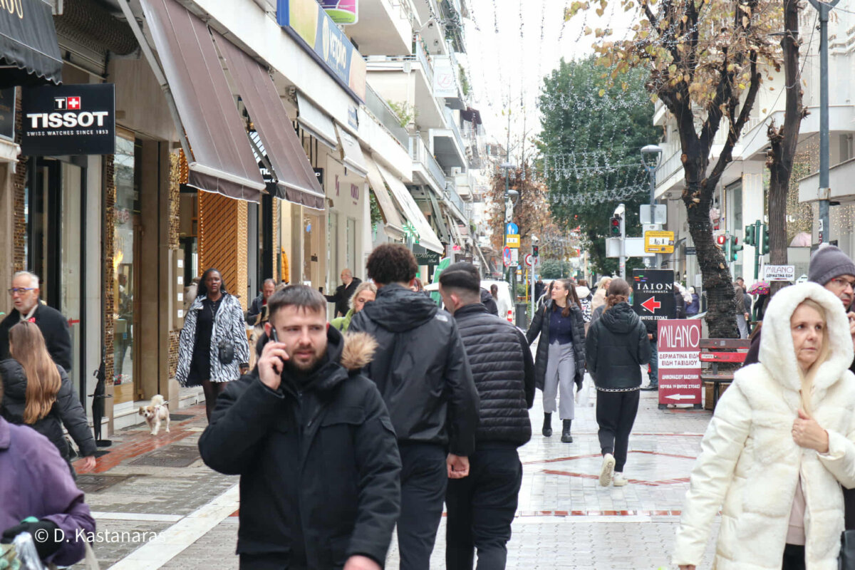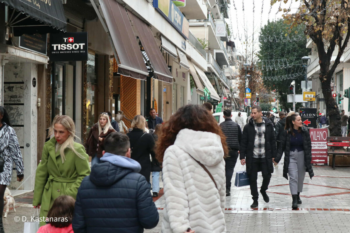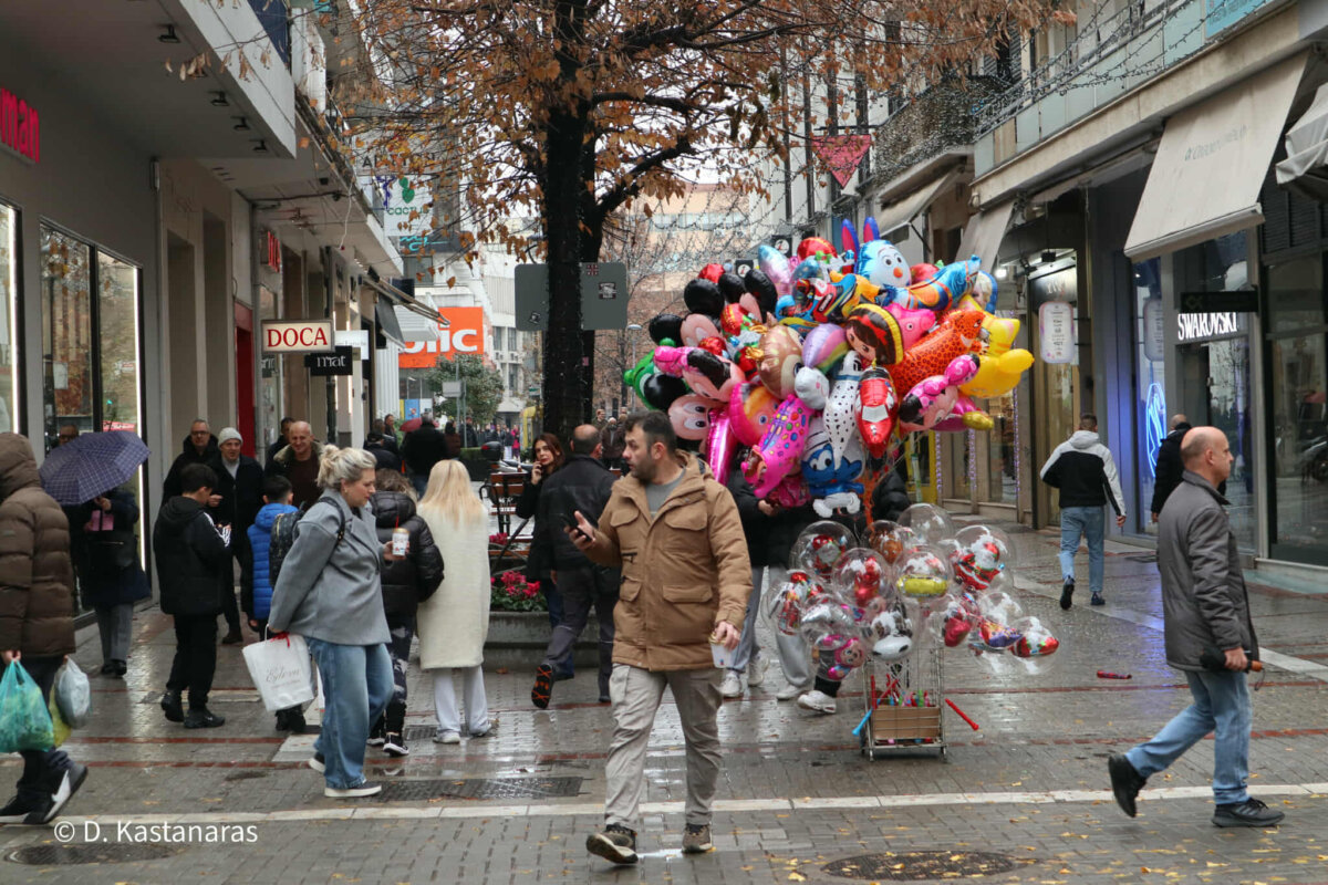 Παιδιά που με τα τριγωνάκια τους και τους κόκκινους σκούφους έχουν γεμίσει το κέντρο της πόλης με τα κάλαντα των Χριστουγέννων, συντροφεύοντας και όλους εκείνους που έχουν αποφασίσει να κάνουν τις αγορές τους σήμερα το πρωί.