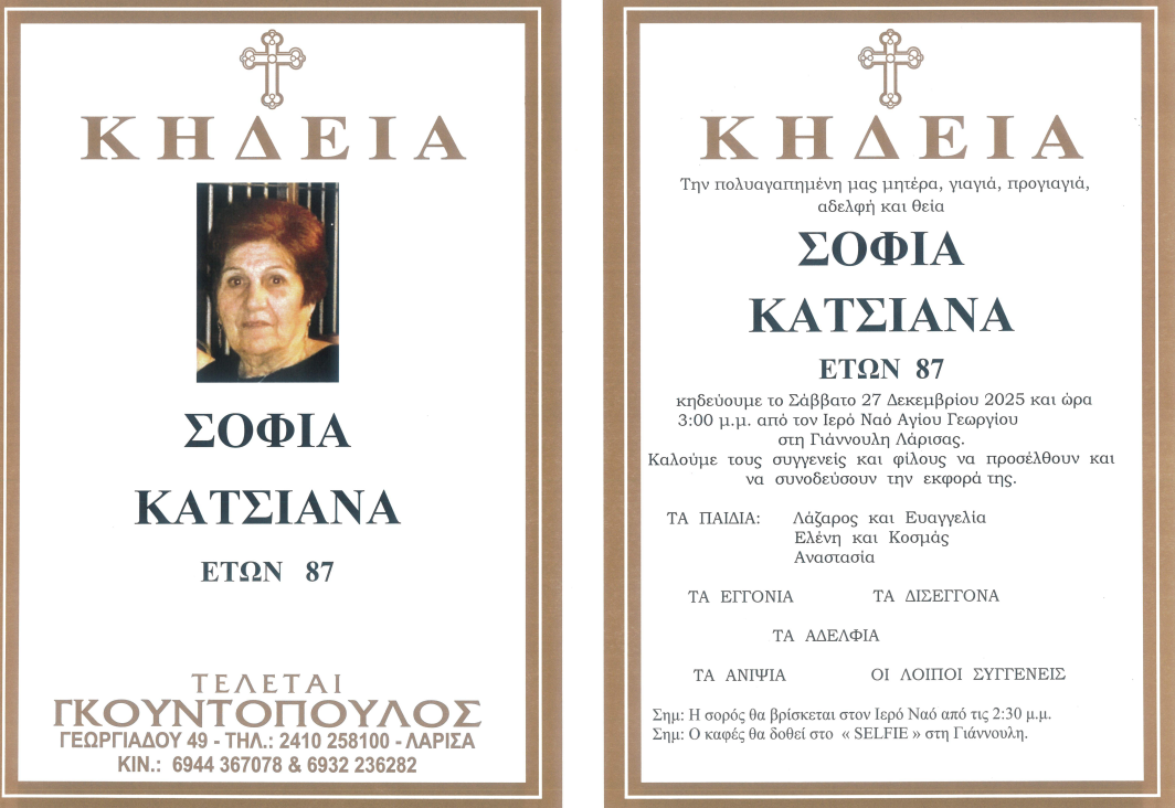 Έφυγε σε ηλικία 87 ετών η Σοφία Κατσιάνα.