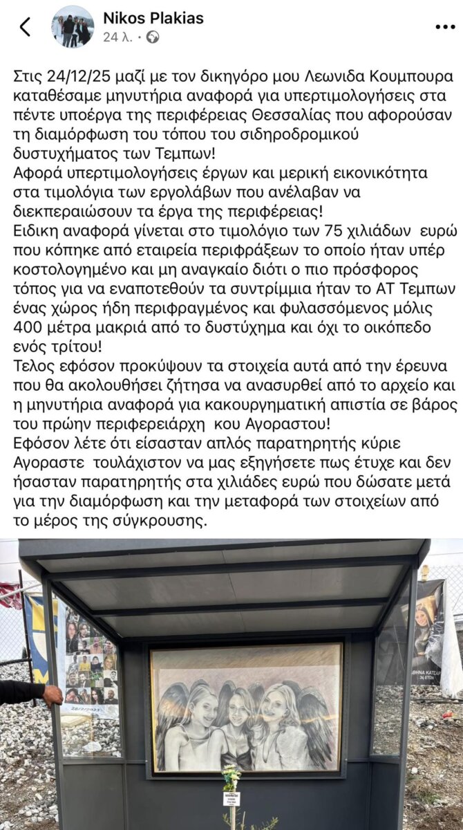 “Στις 24/12/25 μαζί με τον δικηγόρο μου Λεωνίδα Κουμπούρα καταθέσαμε μηνυτήρια αναφορά για υπερτιμολογήσεις στα πέντε υποέργα της περιφέρειας Θεσσαλίας που αφορούσαν τη διαμόρφωση του τόπου του σιδηροδρομικού δυστυχήματος των Τεμπων! Αφορά υπερτιμολογήσεις έργων και μερική εικονικότητα στα τιμολόγια των εργολάβων που ανέλαβαν να διεκπεραιώσουν τα έργα της περιφέρειας!