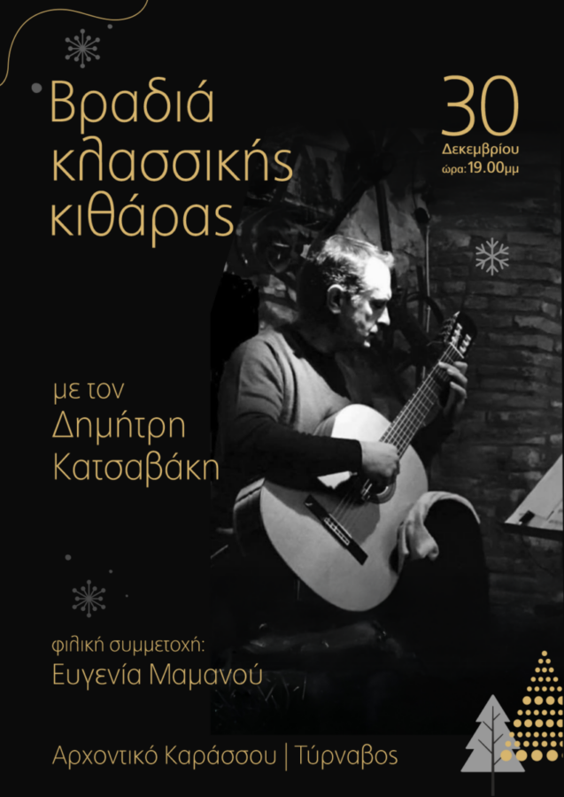 Βραδιά κλασσικής κιθάρας με τον Δημήτρη Κατσαβάκη την Τρίτη 30 Δεκεμβρίου 2025 και ώρα 19:00΄, στο Αρχοντικό Καράσσου στον Τύρναβο, πίνοντας ζεστό κρασί glühwein.