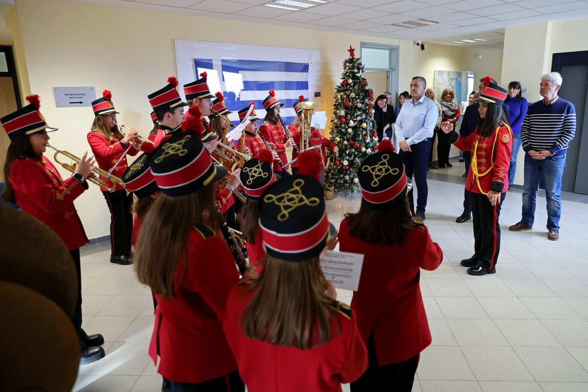 Μια ευχάριστη έκπληξη επιφύλαξαν τα παιδιά της Φιλαρμονικής μπάντας του δήμου Αλμυρού στον Περιφερειάρχη Θεσσαλίας κ. Δημ. Κουρέτα, καθώς εμφανίστηκαν σήμερα Τρίτη το πρωί στο γραφείο του με υπέροχες κόκκινες στολές με σιρίτια και πηλήκια, λέγοντας με τον δικό τους ξεχωριστό τρόπο τα κάλαντα και ευχήθηκαν Καλή Χρονιά, θυμίζοντας πραγματικούς μικρούς καρυοθραύστες.