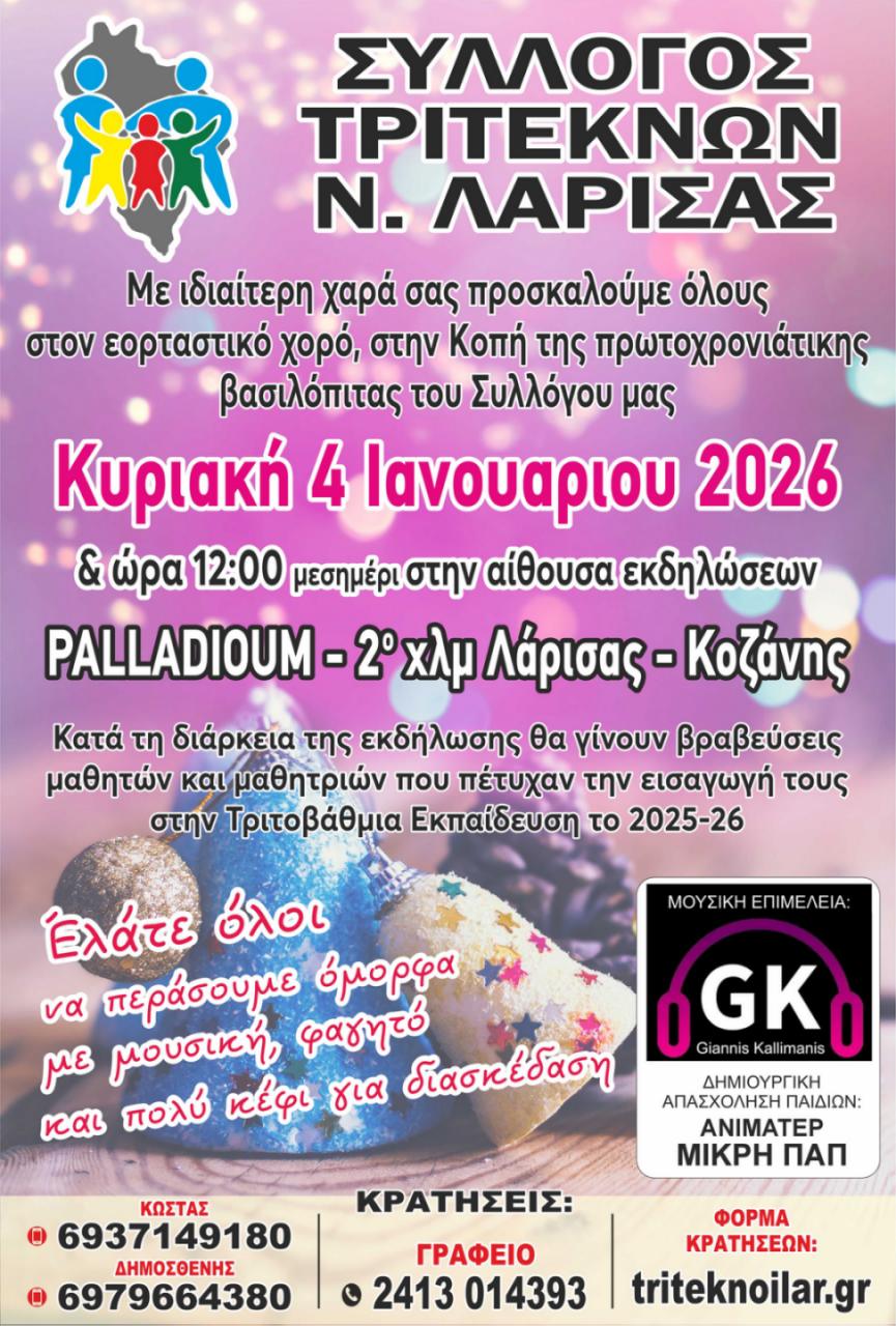 Ο Σύλλογος Τριτέκνων Νομού Λάρισας διοργανώνει τον ετήσιο εορταστικό του χορό, αλλά και την κοπή της πρωτοχρονιάτικης βασιλόπιτας την Κυριακή 4 Ιανουαρίου 2026 και ώρα 12:00 μεσημέρι στην αίθουσα εκδηλώσεων PALLADIOUM – 2ο χλμ Λάρισας – Κοζάνης.