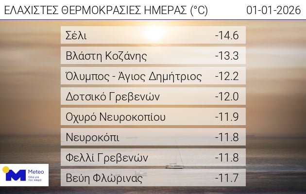 Σύμφωνα με το δίκτυο αυτόματων μετεωρολογικών σταθμών του Εθνικού Αστεροσκοπείου Αθηνών / meteo.gr οι οκτώ χαμηλότερες ελάχιστες θερμοκρασίες κατά τις πρωινές ώρες της Πέμπτης 1η Ιανουαρίου, είχαν ως εξής: