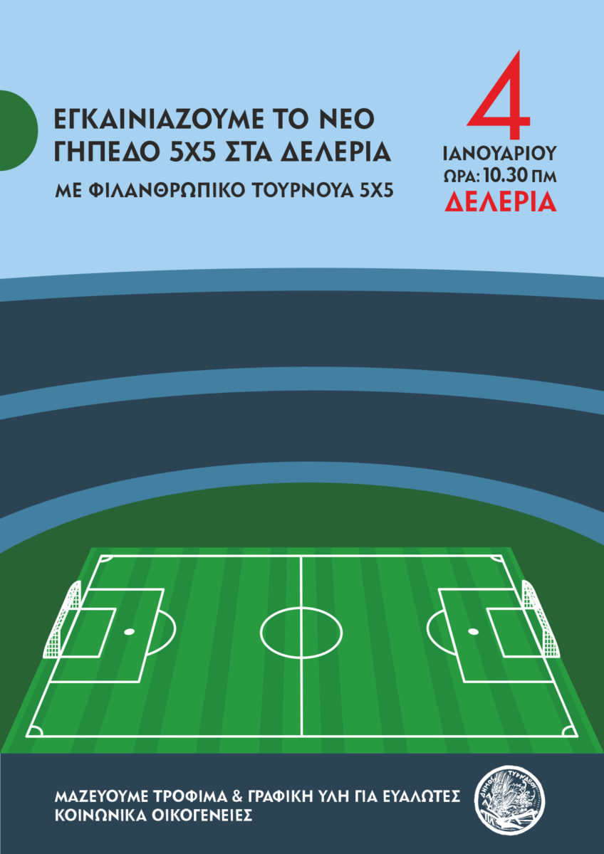 Με φιλανθρωπικό τουρνουά 5Χ5 εγκαινιάζεται το νέο γήπεδο στα Δελέρια. Το τουρνουά θα πραγματοποιηθεί την Κυριακή 4 Ιανουαρίου 2026 στις 10:30′ ενώ στο χώρο του γηπέδου θα συγκεντρωθούν τρόφιμα και γραφική ύλη για ευάλωτες κοινωνικά οικογένειες.