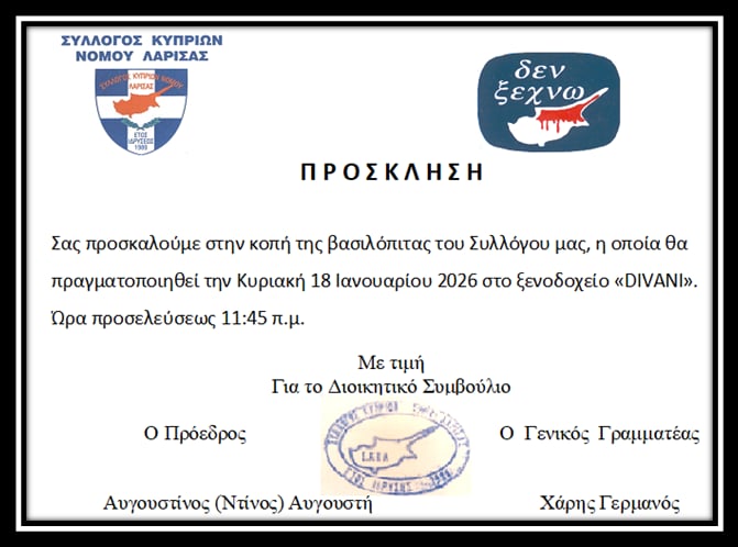 Την πρωτοχρονιάτικη πίτα κόβει ο Σύλλογος Κυπρίων νομού Λάρισας την Κυριακή 18 Ιανουαρίου.