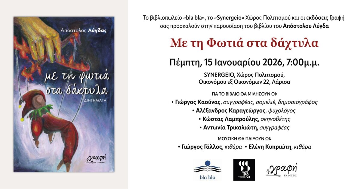 Την Πέμπτη 15 Ιανουαρίου και ώρα 19:00το βιβλιοπωλείο «blabla» και οι εκδόσεις Γραφή σας προσκαλούν στην παρουσίαση του βιβλίου του Απόστολου Λύγδα «Με την φωτιά στα δάχτυλα» στο «SYNERGEIO», Χώρος Πολιτισμού, Οικονόμου εξ Οικονόμων 22 στη Λάρισα.