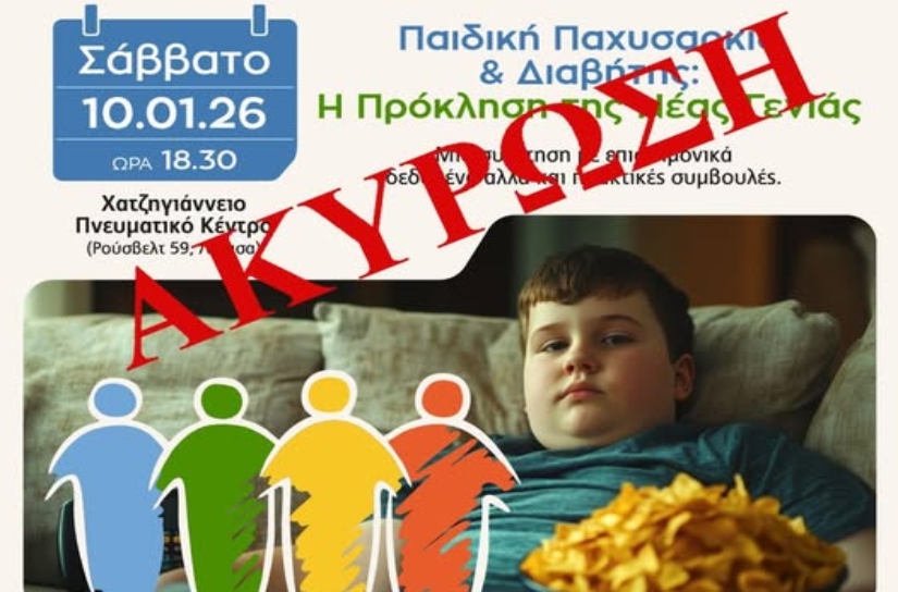 Εκ μέρους της Αντιδημαρχίας Παιδείας και της Διεύθυνσης Παιδείας, θα θέλαμε να σας ενημερώσουμε ότι η 6η Διάλεξη Υγείας με θέμα «Παιδική Παχυσαρκία & Διαβήτης», η οποία ήταν προγραμματισμένη για το Σάββατο 10 Ιανουαρίου στο Χατζηγιάννειο Πνευματικό Κέντρο, δεν θα πραγματοποιηθεί λόγω έκτακτου κωλύματος.