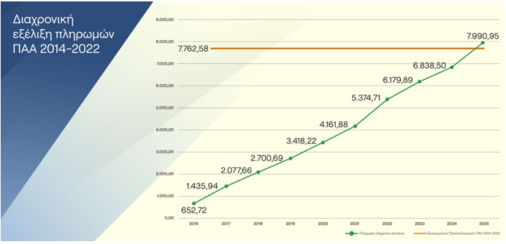 Το σύνολο των πληρωμών και από τα δύο προγράμματα, ΠΑΑ και ΣΣ ΚΑΠ, ανήλθαν εντός του 2025 σε 1.447,64 εκ. €, το οποίο είναι και το μεγαλύτερο ποσό που έχει πληρωθεί σε δράσεις του Πυλώνα ΙΙ της ΚΑΠ εντός του ίδιου έτους εφαρμογής της.