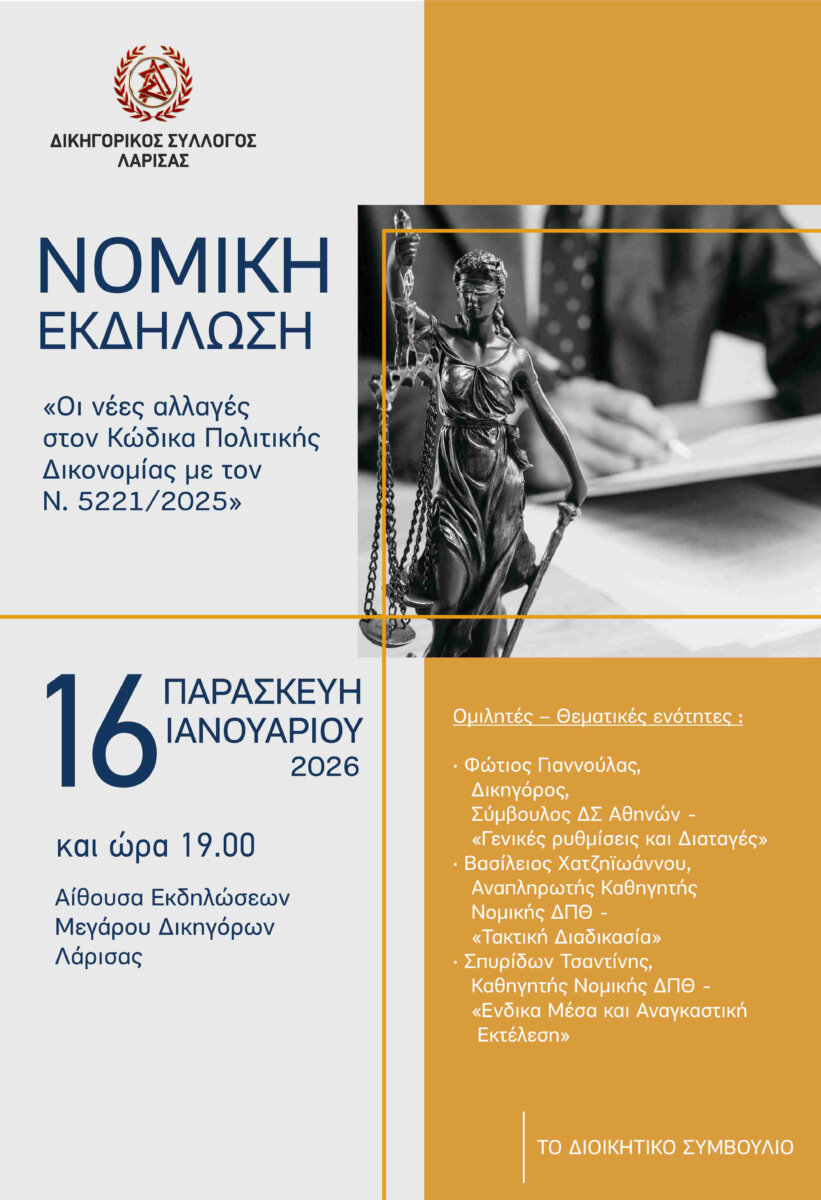 Εκδήλωση σχετικά με τις πρόσφατες τροποποιήσεις στον κώδικα πολιτικής δικονομίας διοργανώνει ο Δικηγορικός Σύλλογος Λάρισας την Παρασκευή 16 Ιανουαρίου και ώρα 19.00 στην Αίθουσα Εκδηλώσεων Μεγάρου Δικηγόρων Λάρισας.