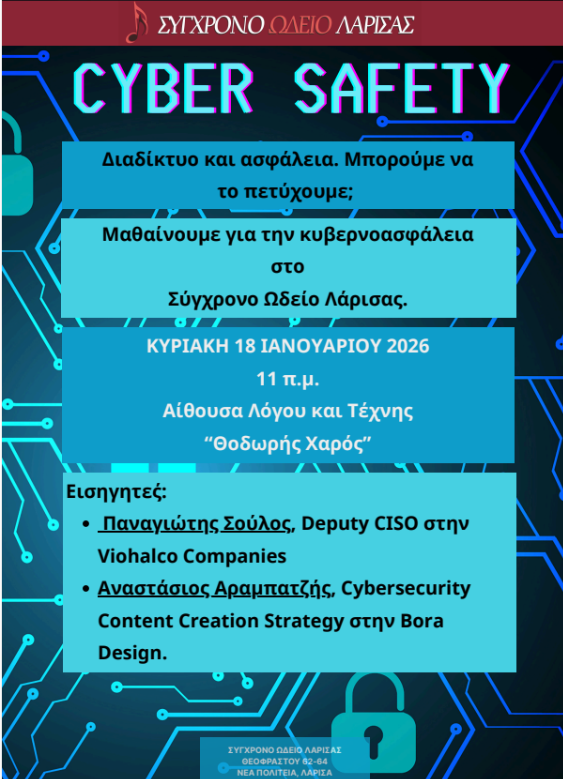 Γι’ αυτό είναι σημαντικό να γνωρίζουμε για την κυβερνοασφάλεια. Σας καλούμε λοιπόν να μάθετε μαζί μας αυτή την Κυριακή 18 Ιανουαρίου 2026 και ώρα 11.00 π.μ. στο Σύγχρονο Ωδείο Λάρισας για την κυβερνοασφάλεια και τις καλές πρακτικές πλοήγησης στο διαδίκτυο.