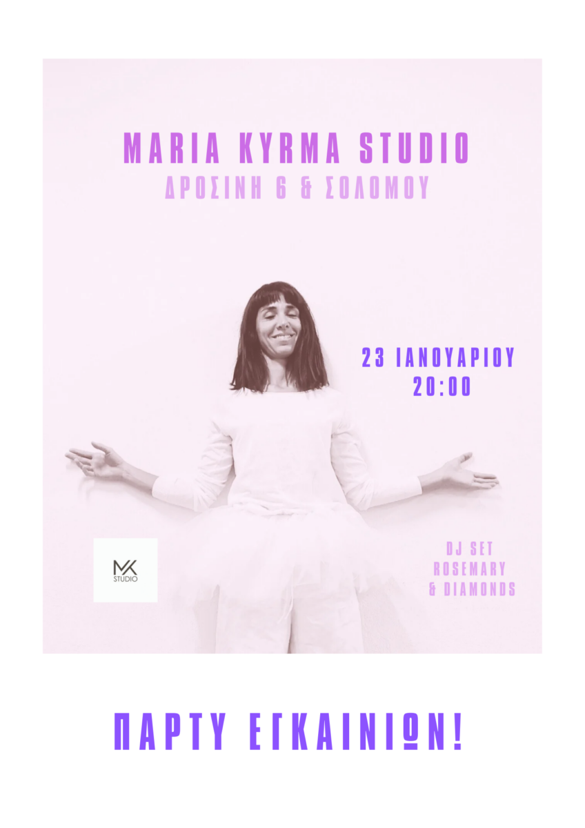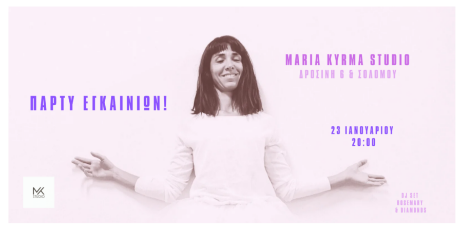 Το Maria Kyrma Studio, που βρίσκεται στη Δροσίνη 6 & Σολωμού, γιορτάζει την έναρξη λειτουργίας του και σας προσκαλεί την Παρασκευή 23 Ιανουαρίου στις 20:00 σε ένα πάρτυ γνωριμίας!