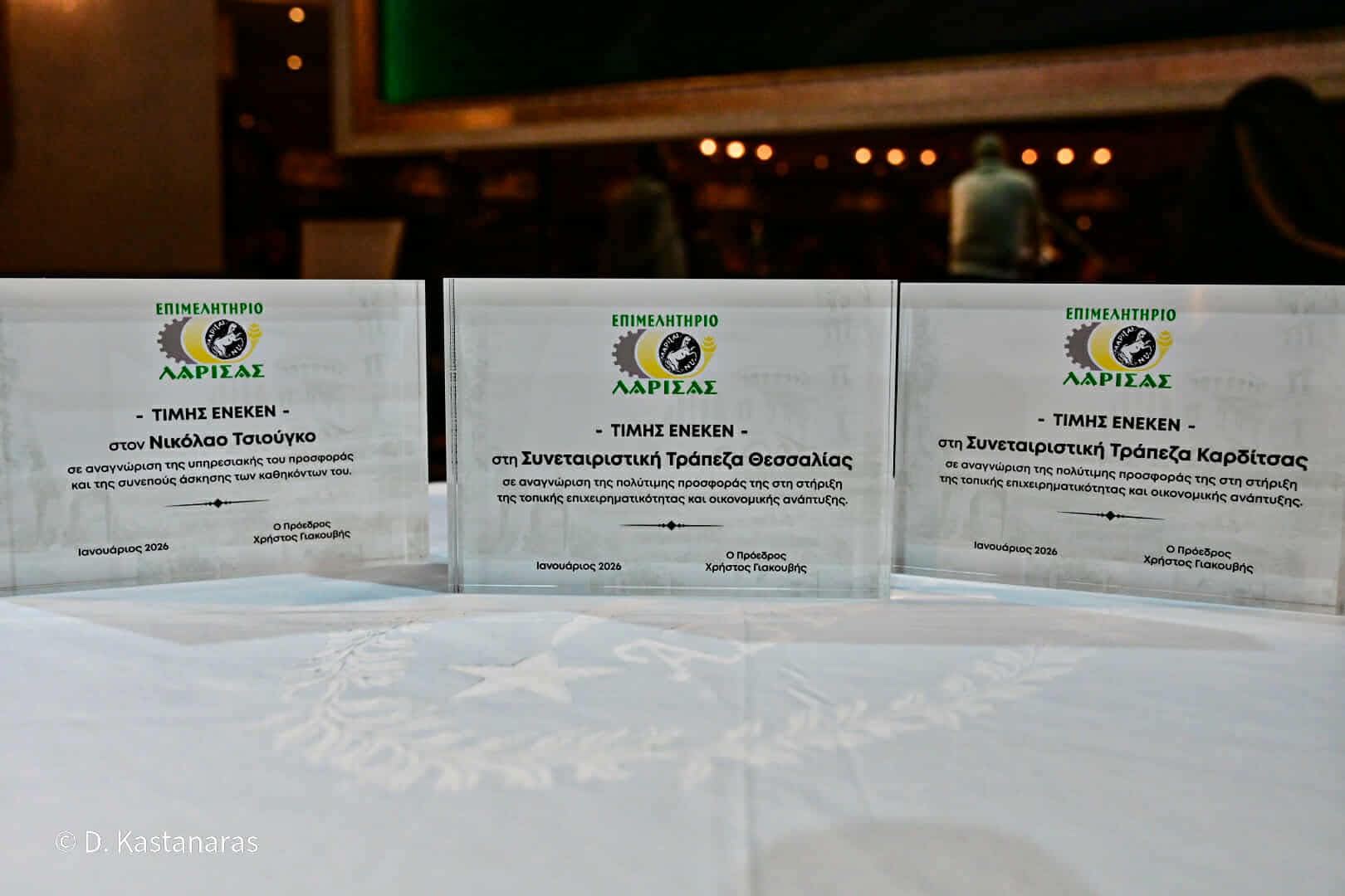 Παράλληλα, απονεμήθηκαν τιμητικές διακρίσεις στη Συνεταιριστική Τράπεζα Καρδίτσας, στη Συνεταιριστική Τράπεζα Θεσσαλίας, καθώς και στον υπάλληλο του Επιμελητηρίου, κ. Τσούγκο, ο οποίος συνταξιοδοτήθηκε.