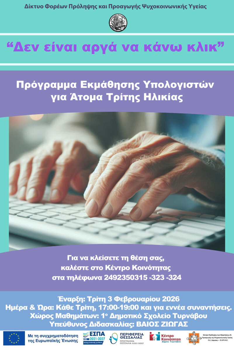 Στο πλαίσιο δράσης του Δικτύου Φορέων Πρόληψης και Προαγωγής Ψυχοκοινωνικής Υγείας, το Κέντρο Κοινότητας Δήμου Τυρνάβου σε συνεργασία με τον Εκπαιδευτικό του 1ου Δημοτικού Σχολείου Τυρνάβου κ. Βάιο Ζιώγα διοργανώνουν ομάδα εκμάθησης Η/Υ σε ηλικιωμένους, στον Τύρναβο με τίτλο: «Δεν Είναι Αργά να Κάνω Κλικ»: