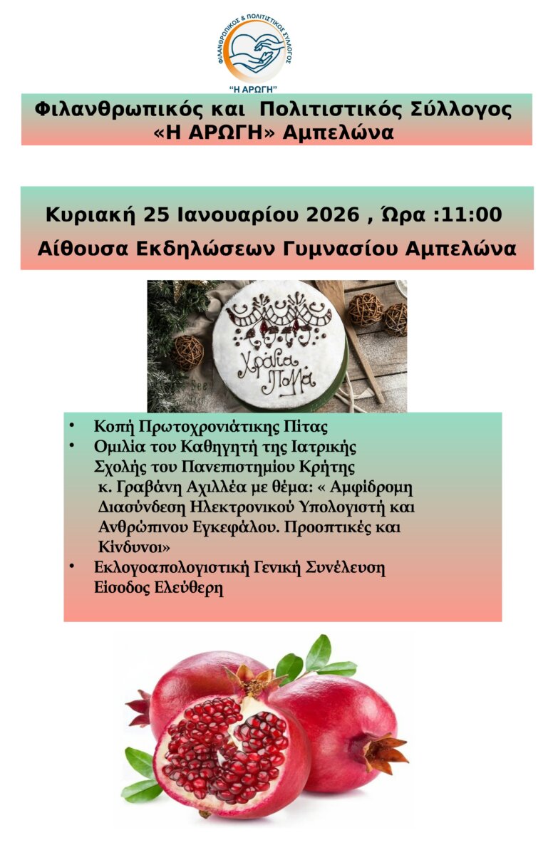 Μία εξαιρετικά ενδιαφέρουσα ομιλία από τον καθηγητή της Ιατρικής Σχολής του Πανεπιστημίου Κρήτης και Ερευνητή του Ινστιτούτου Τεχνολογίας και Έρευνας κ. Γραβάνη Αχιλλέα με θέμα: «Αμφίδρομη Διασύνδεση Ηλεκτρονικού Υπολογιστή και Ανθρώπινου Εγκεφάλου: Προοπτικές και Κίνδυνοι» θα πραγματοποιηθεί την Κυριακή 25 Ιανουαρίου 2026 και ώρα 11:00 π.μ. στην αίθουσα εκδηλώσεων του Γυμνασίου Αμπελώνα.