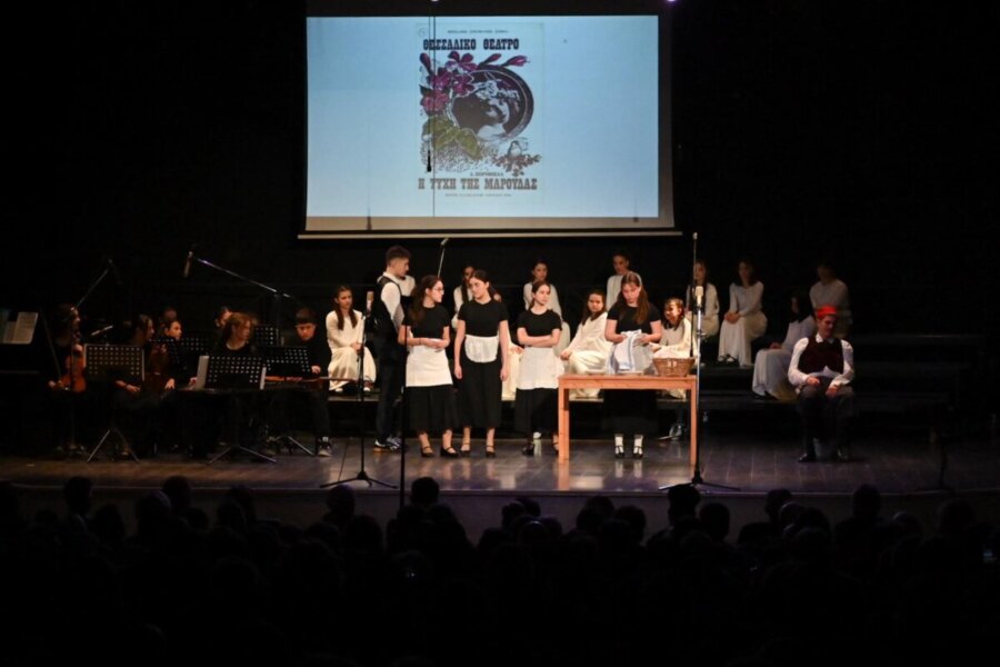 Μαθητές και μαθήτριες – εναλλάσσοντας ρόλους και κοστούμια και ερμηνεύοντας τις μουσικές συνθέσεις των έργων – παρουσίασαν αποσπάσματα των παραστάσεων: Η τύχη της Μαρούλας, του Δημητρίου Κορομηλά, σε σκηνοθεσία Μηνά Χρηστίδη, μουσική Λουκιανού Κηλαηδόνη, με την Άννα Βαγενά στον ρόλο της Μαρούλας (1976), Ηλέκτρα του Ευριπίδη, σε σκηνοθεσία και χορογραφίες Κώστα Τσιάνου, μουσική Νίκου Ξυδάκη, με τη Λυδία Κονιόρδου στον ρόλο της Ηλέκτρας (1988), Φοιτηταί, του Γρηγορίου Ξενόπουλου, σε θεατρικό κείμενο και σκηνοθεσία Κώστα Τσιάνου και μουσική Γιούρι Στούπελ (1993) και Το καπλάνι της βιτρίνας, της Άλκης Ζέη, σε κείμενο και σκηνοθεσία Δήμητρας Λαρεντζάκη και μουσική Κώστα Βόμβολου (2023).