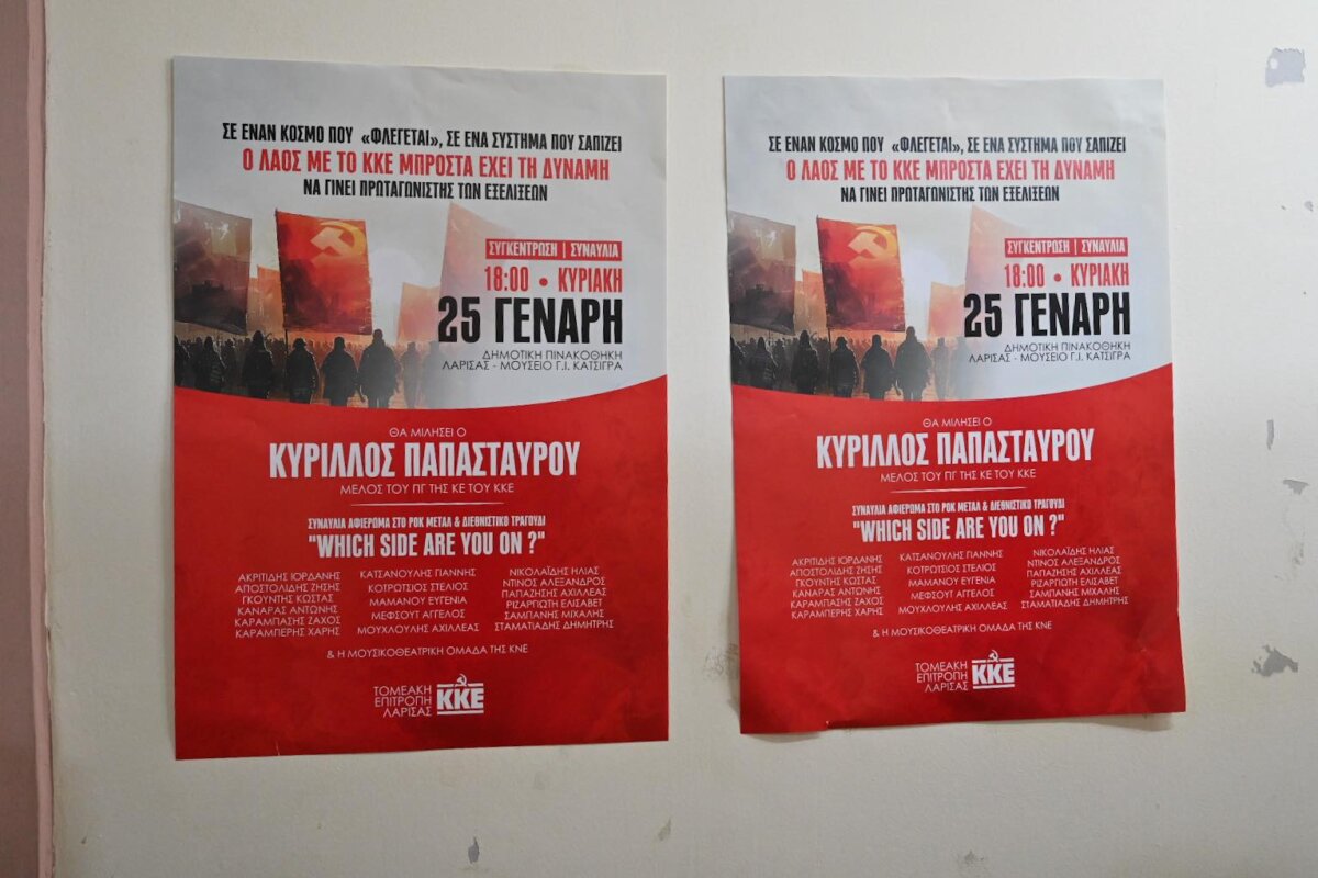Μεγάλη πολιτική – πολιτιστική εκδήλωση διοργανώνει η Τομεακή Επιτροπή Λάρισας του ΚΚΕ την Κυριακή 25 Γενάρη, στις 6 μ.μ., στο Αμφιθέατρο της Δημοτικής Πινακοθήκης – Μουσείο Γ. Ι. Κατσίγρα, με θέμα: «Σε έναν κόσμο που “φλέγεται”, σε ένα σύστημα που σαπίζει, ο λαός, με το ΚΚΕ μπροστά, έχει τη δύναμη να γίνει πρωταγωνιστής των εξελίξεων».