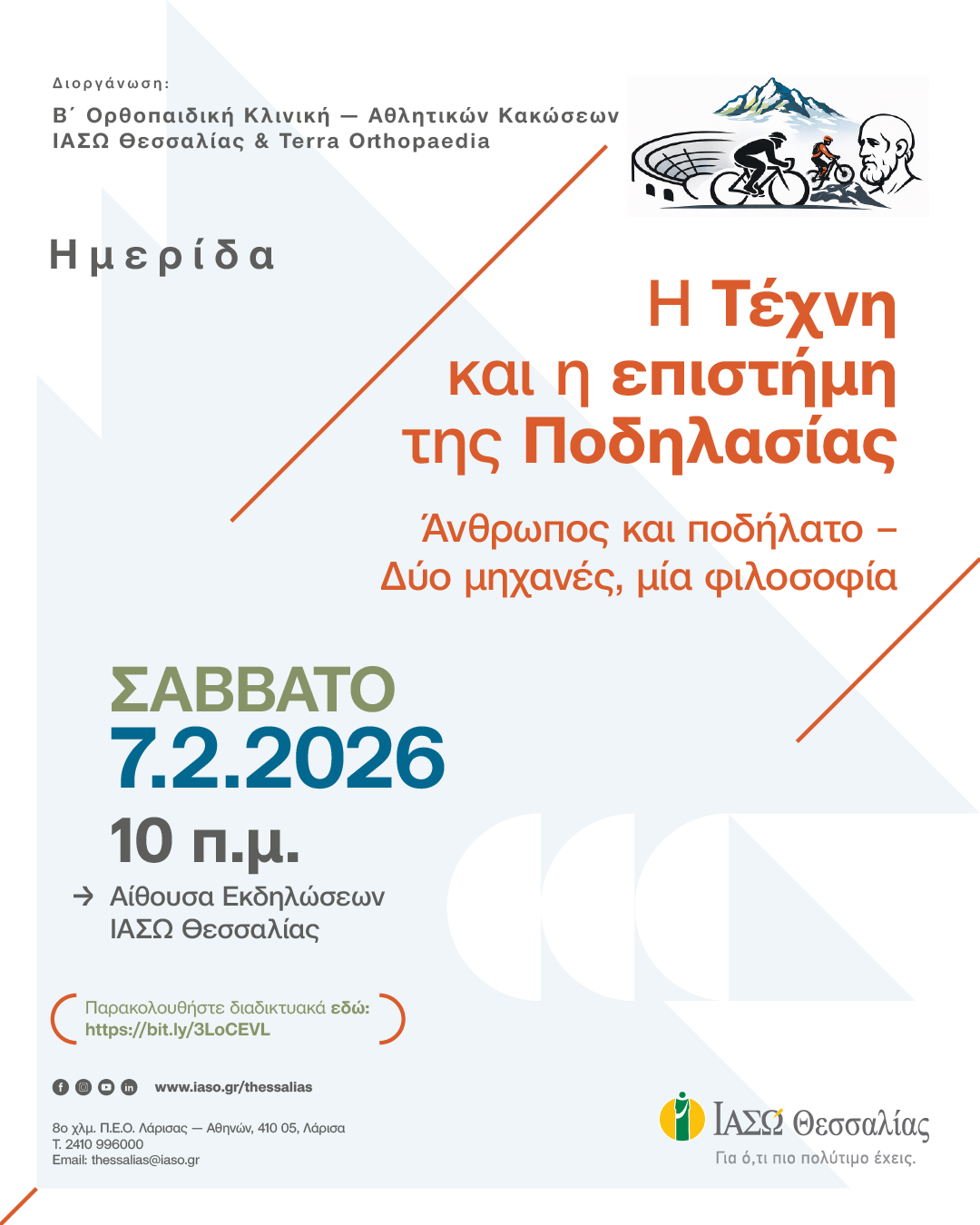 Η Β΄ Ορθοπαιδική Κλινική – Αθλητικών Κακώσεων του ΙΑΣΩ Θεσσαλίας διοργανώνει το Σάββατο 7 Φεβρουαρίου 2026 την επιστημονική ημερίδα «Άνθρωπος και ποδήλατο – Δύο μηχανές, μία φιλοσοφία», αφιερωμένη στην αγωνιστική ποδηλασία.