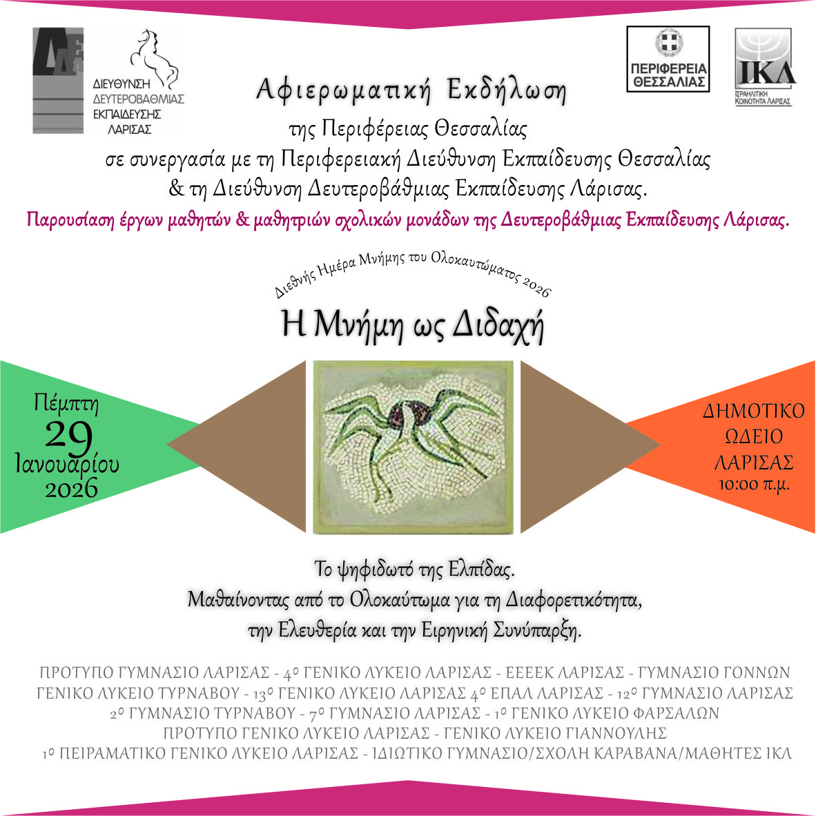 Η εκδήλωση διοργανώνεται στο πλαίσιο της Διεθνούς Ημέρας Μνήμης του Ολοκαυτώματος και θα πραγματοποιηθεί την Πέμπτη 29 Ιανουαρίου 2026 στις 10:00 π.μ στο αμφιθέατρο του Δημοτικού Ωδείου Λάρισας.