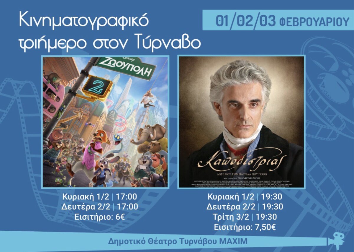 Στο πλαίσιο των πολιτιστικών δράσεων που προγραμματίζει ο Δήμος Τυρνάβου, θα πραγματοποιηθούν κινηματογραφικές προβολές στο Δημοτικό Θέατρο της πόλης «ΜΑΞΙΜ», προσφέροντας στους πολίτες τη δυνατότητα να απολαύσουν ένα ξεχωριστό κινηματογραφικό τριήμερο στον Τύρναβο.