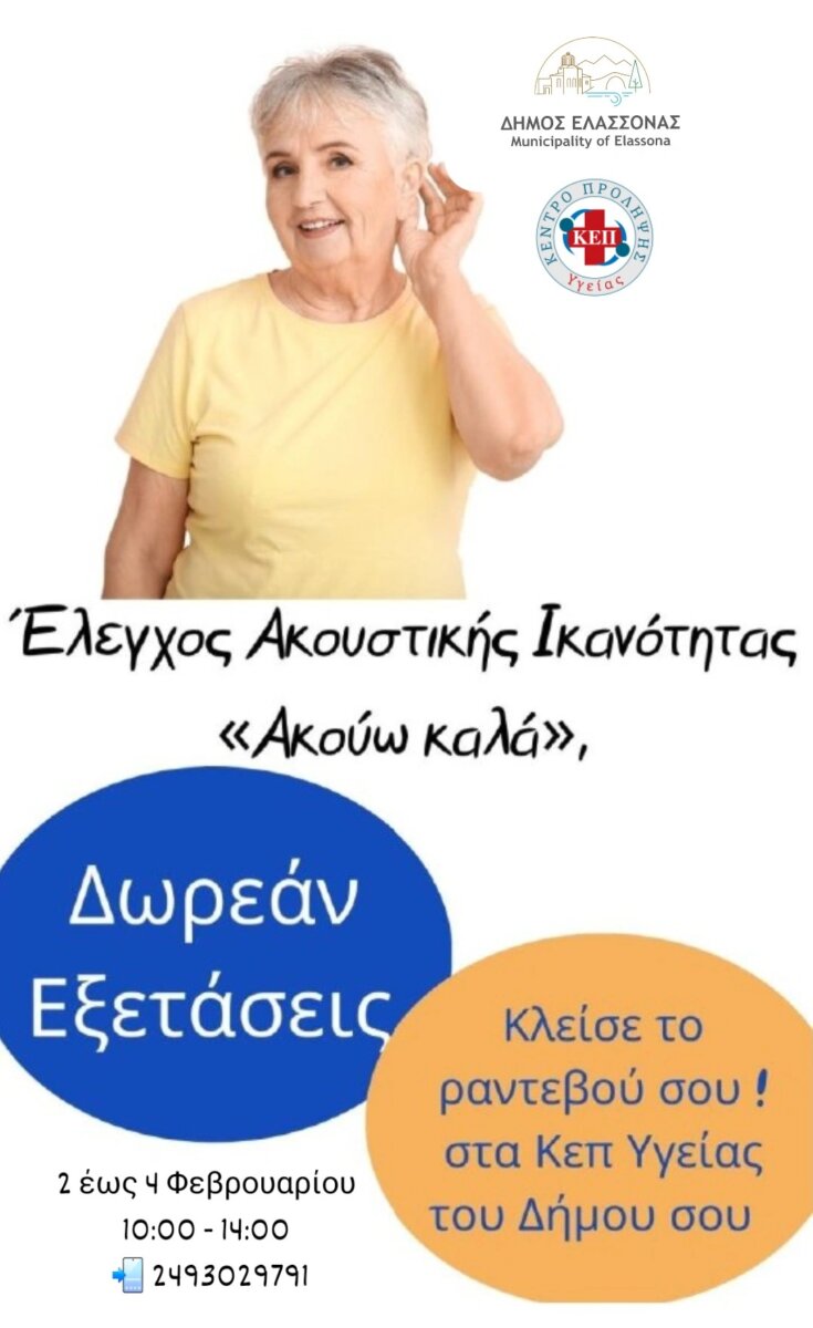 Δράση ενημέρωσης και πρόληψης με θέμα τον έλεγχο ακουστικής ικανότητας με τίτλο «Ακούω καλά» διοργανώνει η Αντιδημαρχία Κοινωνικής Πρόνοιας του Δήμου Ελασσόνας, σε συνεργασία με το Ελληνικό Διαδημοτικό Δίκτυο Υγιών Πόλεων (ΕΔΔΥΠΠΥ), μέσω του ΚΕΠ Υγείας του Δήμου.