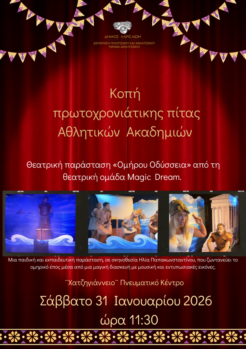 Το Τμήμα Αθλητισμού του Δήμου Λαρισαίων προσκαλεί τους μικρούς αθλητές των Ακαδημιών στην κοπή της πρωτοχρονιάτικης πίτας, το Σάββατο 31 Ιανουαρίου 2026 και ώρα 11:30, στο «Χατζηγιάννειο» Πνευματικό Κέντρο.