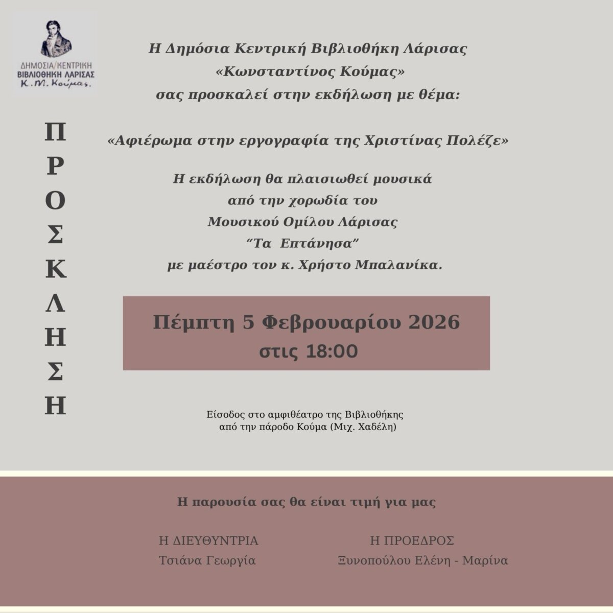 Η εκδήλωση θα γίνει στο αμφιθέατρο της Βιβλιοθήκης την Πέμπτη 5 Φεβρουαρίου 2026 στις 18.00 και θα έχει τίτλο « Αφιέρωμα στην εργογραφία της Χριστίνας Πολέζε».