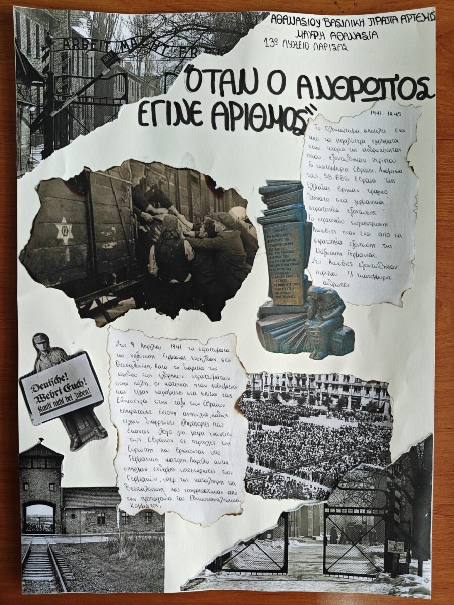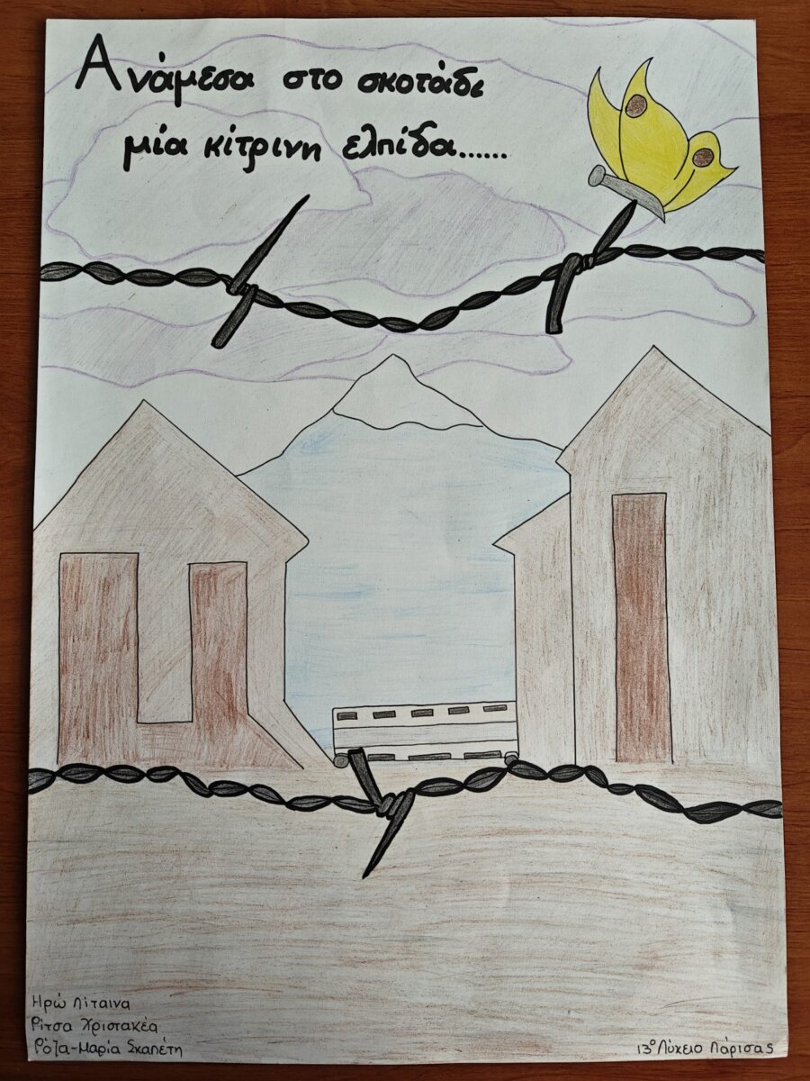 Συγκεκριμένα οι μαθήτριες της Β’ Λυκείου Ρόζα Σκαπέτη, Ηρώ Λίταινα και Ρίτα Χριστακέα και οι μαθήτριες της Γ’ Λυκείου Άρτεμις Πράπα, Βασιλική Αθανασίου και Αθανασία Μακρή δημιούργησαν δυο ζωγραφικά έργα και δυο κολάζ εμπνευσμένα από τα συγκλονιστικά και απάνθρωπα εκείνα χρόνια που οδήγησαν εκατομμύρια Εβραίων στα στρατόπεδα συγκέντρωσης της Δυτικής Ευρώπης και στο Ολοκαύτωμα.