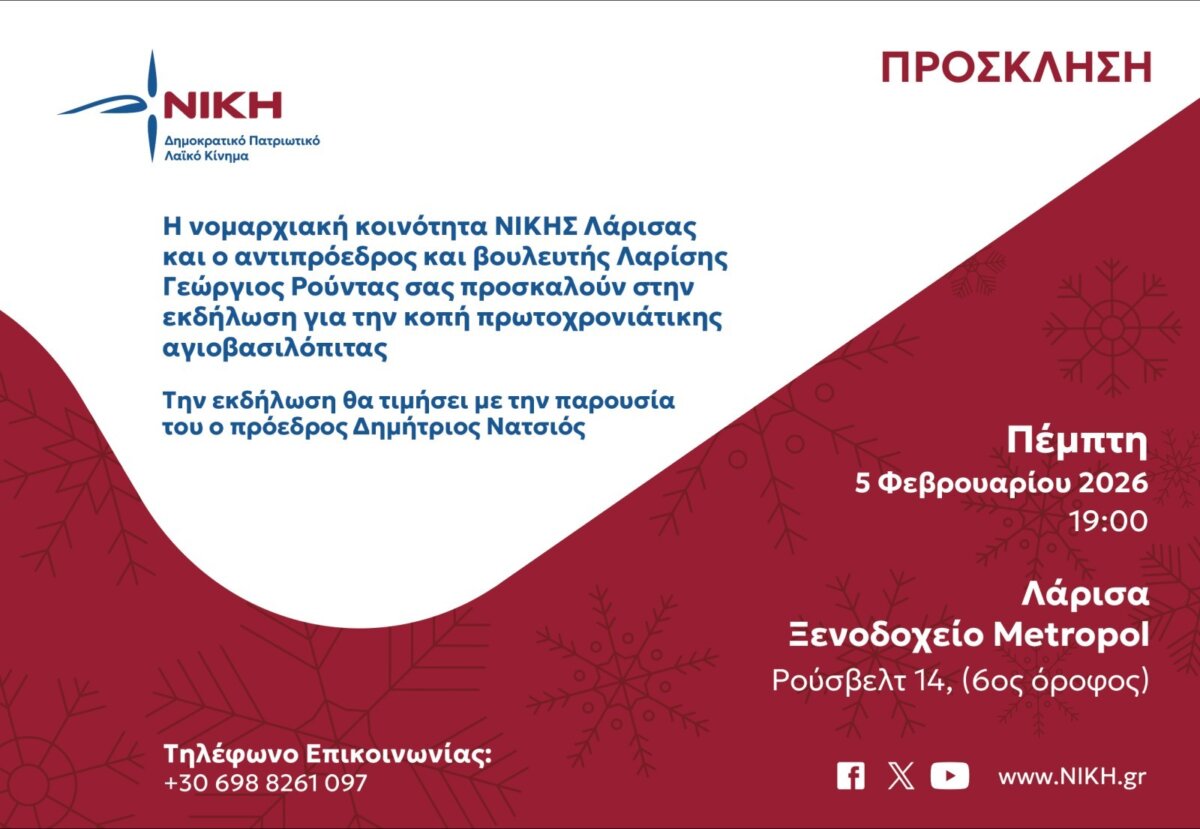 Την ερχόμενη Πέμπτη, 5 Φεβρουαρίου 2026 και ώρα 7:00 μ. μ. στο ξενοδοχείο Μετροπόλ η Νομαρχιακή Κοινότητα ΝΙΚΗΣ Λάρισας και ο Αντιπρόεδρος και Βουλευτής Λάρισας κ. Γεώργιος Ρούντας θα κόψουν την καθιερωμένη πρωτοχρονιάτικη αγιοβασιλόπιτα.