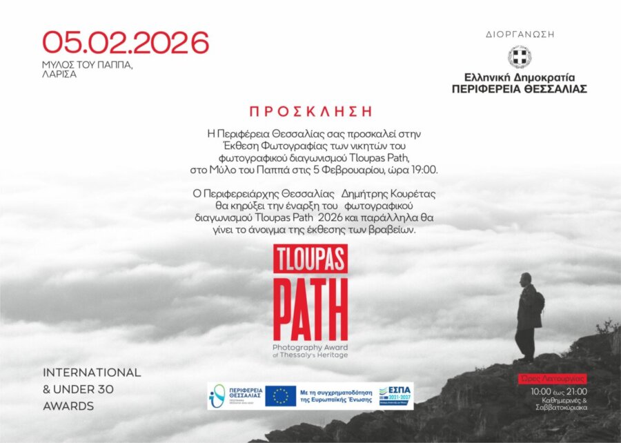 Στις 5 Φεβρουαρίου στις 19:00 ο Περιφερειάρχης Θεσσαλίας Δημήτρης Κουρέτας θα κηρύξει την έναρξη του φωτογραφικού διαγωνισμού Tloupas Path 2026 και παράλληλα θα γίνει το άνοιγμα της έκθεσης των βραβείων.