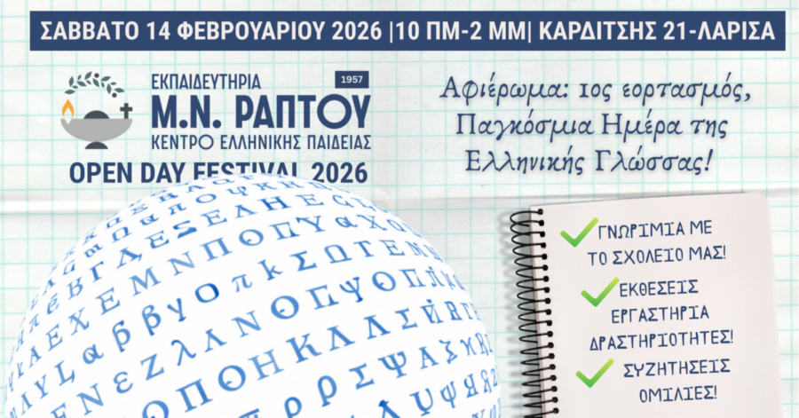 Για έκτη φορά, τα Εκπαιδευτήρια Μ.Ν. Ράπτου διοργανώνουν το ΣΑΒΒΑΤΟ 14 ΦΕΒΡΟΥΑΡΙΟΥ 2026, από τις 10 π.μ. έως τις 2 μ.μ., ημέρα ανοικτών θυρών (Open Day Festival), αφιερωμένη στον πρώτο εορτασμό της Παγκόσμιας Ημέρας της Ελληνικής Γλώσσας.