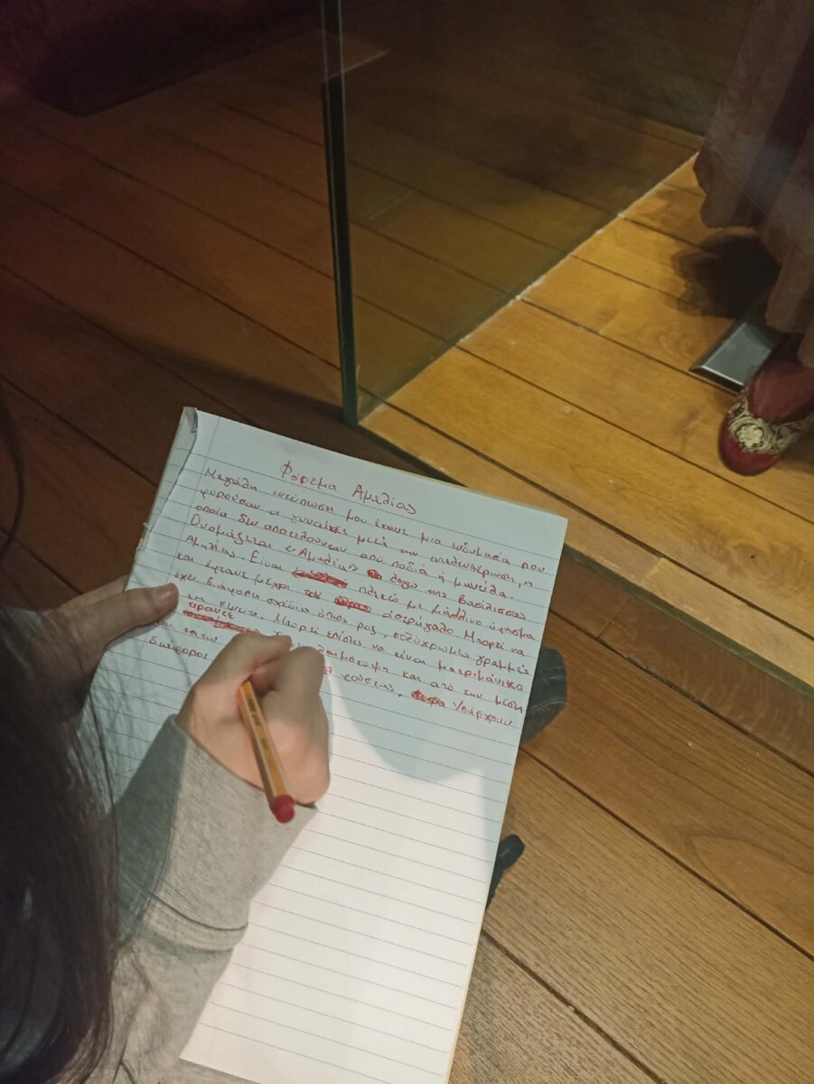 Μετά την ξενάγησή τους στη μόνιμη έκθεση του μουσείου, τα παιδιά κλήθηκαν να επιλέξουν ένα έκθεμα – από τη μόνιμη ή τις περιοδικές εκθέσεις – που τους τράβηξε το ενδιαφέρον. Περιηγήθηκαν σε όλο το μουσείο, παρατήρησαν προσεκτικά τα αντικείμενα, άκουσαν τις ιστορίες τους και, βασισμένα σε όσα είδαν, άκουσαν και γνώριζαν ήδη, έγραψαν τα δικά τους κείμενα, δίνοντας φωνή στα εκθέματα μέσα από τη δική τους ματιά.
