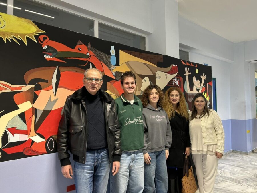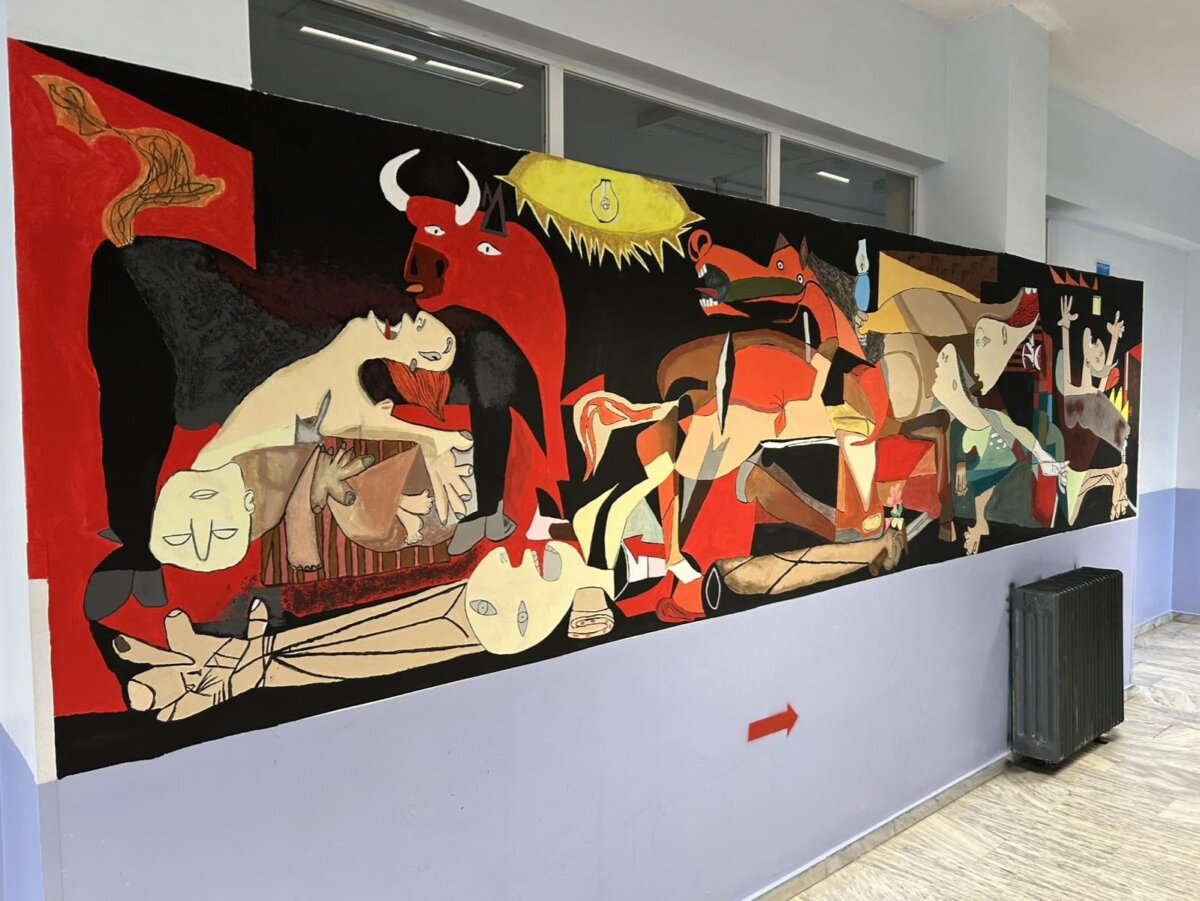 Στον διάδρομο του 1ου ορόφου, οι μαθητές Παναγιώτης Βάγγος και Μαργαρίτα Τσιώνα εμπνεύστηκαν από τη θρυλική «Γκουέρνικα» του Πάμπλο Πικάσο και δημιούργησαν ένα έργο που αποτυπώνει με έντονο συμβολισμό τη φρίκη του πολέμου, τη βία και τον ανθρώπινο πόνο. Μέσα από έντονες μορφές και δυνατές αντιθέσεις, το έργο λειτουργεί ως μια σιωπηλή αλλά ηχηρή υπενθύμιση των συνεπειών της σύγκρουσης και της ανάγκης για ειρήνη, ενσυναίσθηση και ανθρωπιά. Η επιλογή του συγκεκριμένου έργου αποκτά ιδιαίτερη σημασία στον σχολικό χώρο, ενθαρρύνοντας τον διάλογο και τον προβληματισμό των μαθητών.